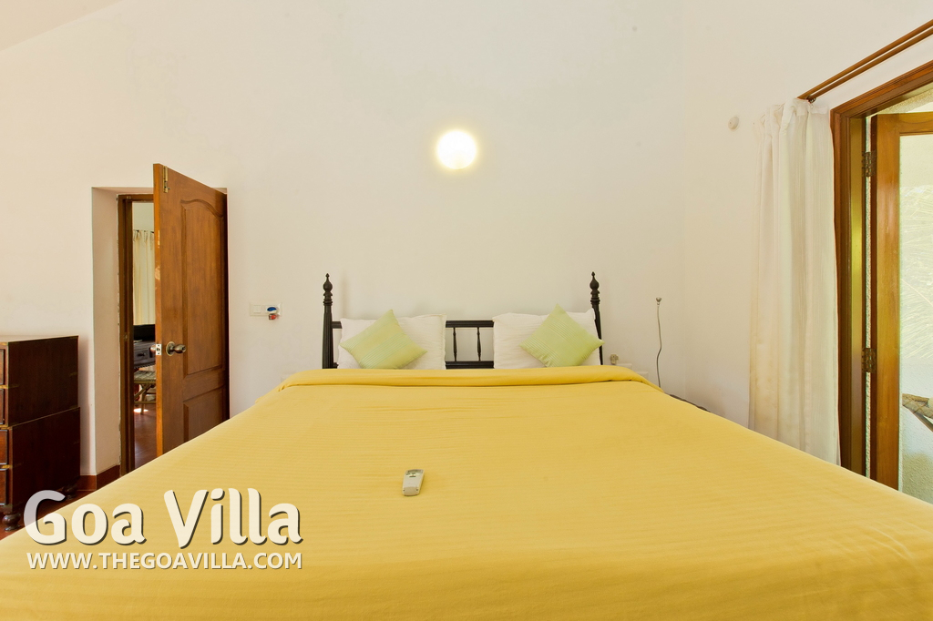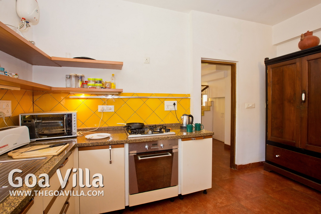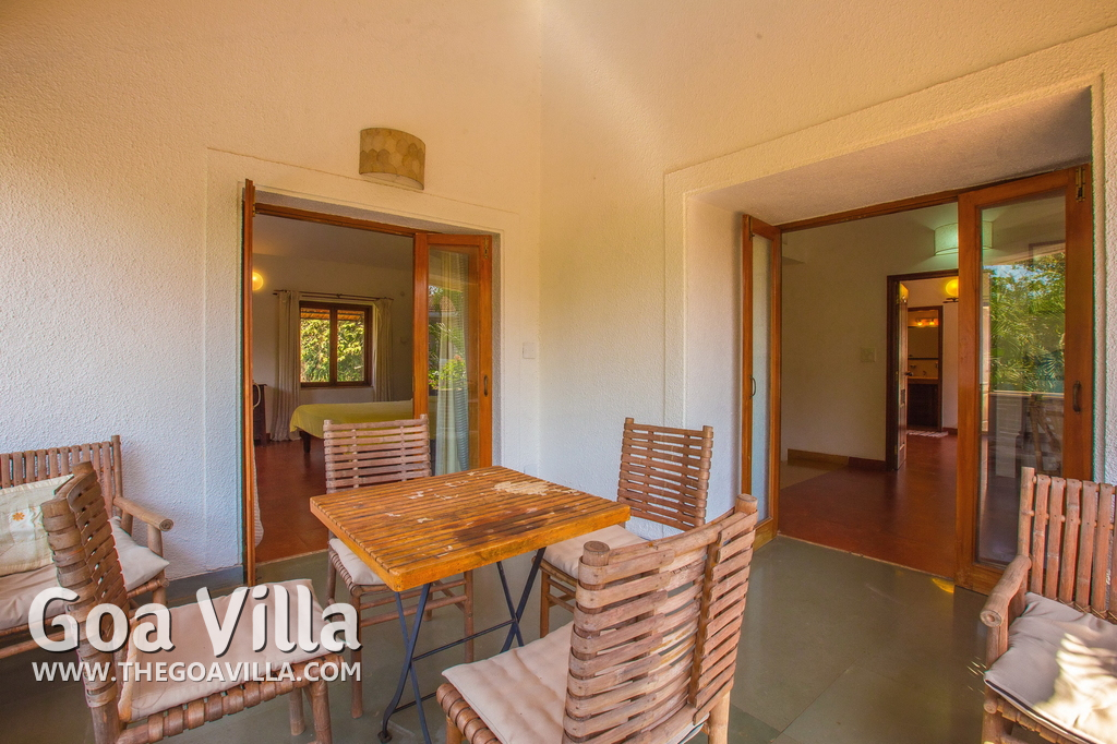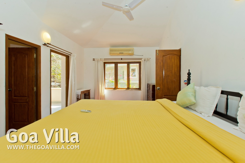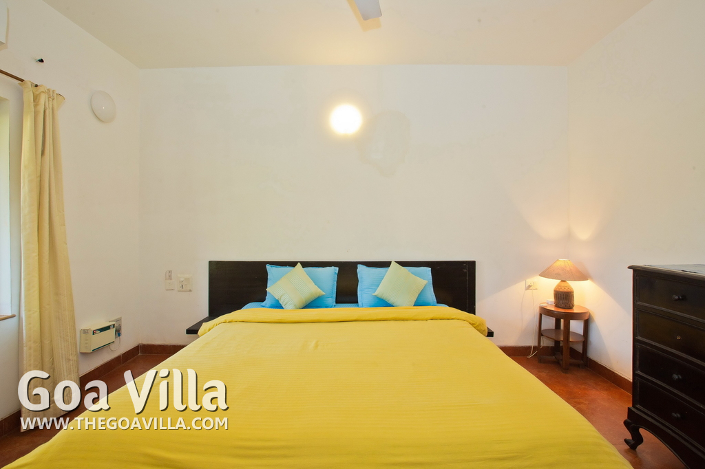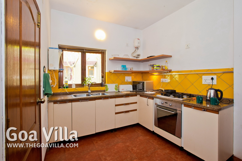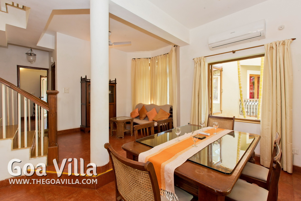 Kitchen, Dining – The dining area is at one side the living room beside a wide window. Glass-top table with sitting for 6 guests. This North Goa villa for rent also has a well equipped kitchen. You can use the large refrigerator, microwave, electric kettle, toaster, water purifier, and cooking station. Cutlery and cookware is provided.