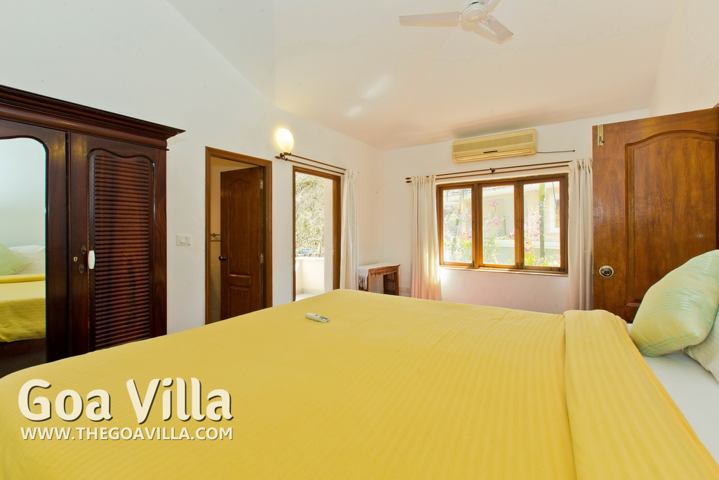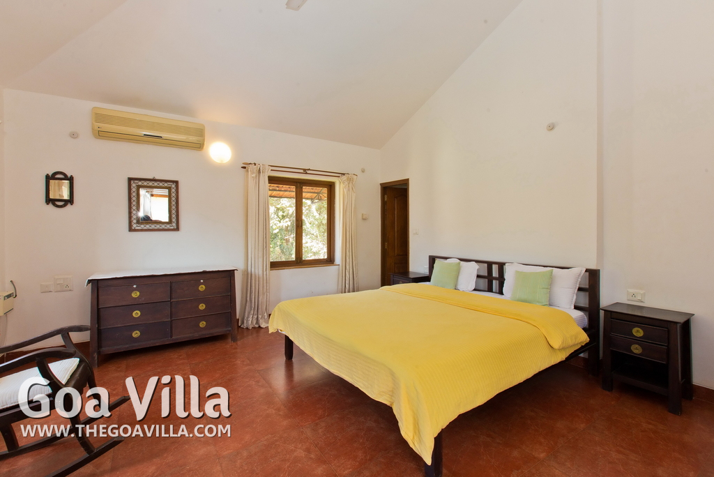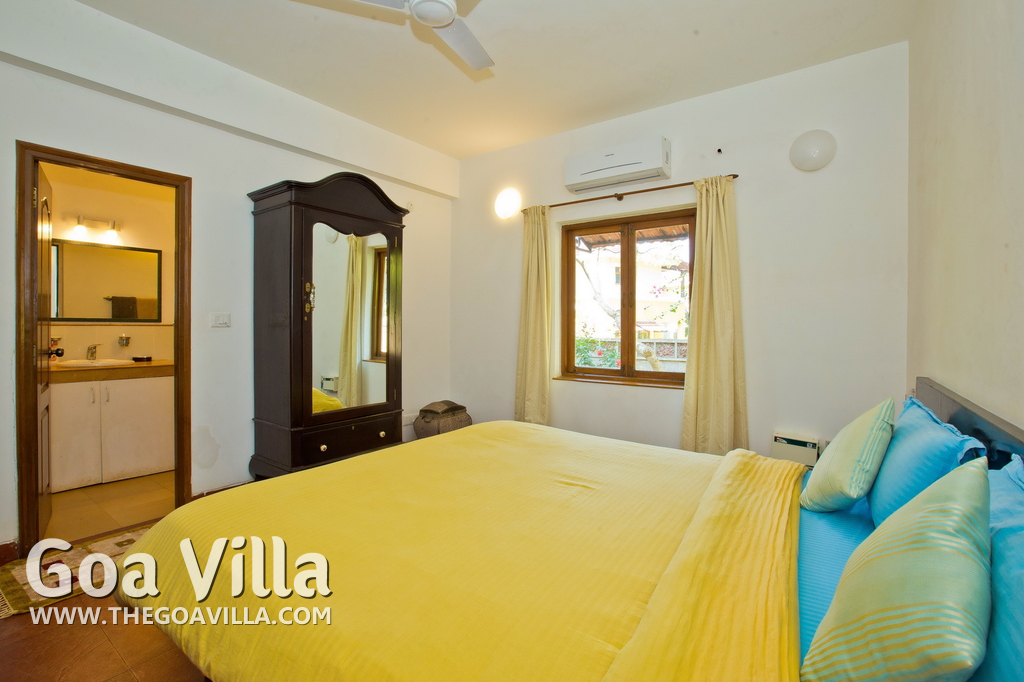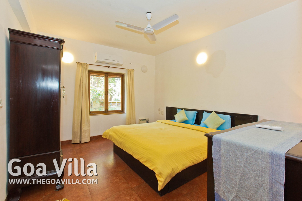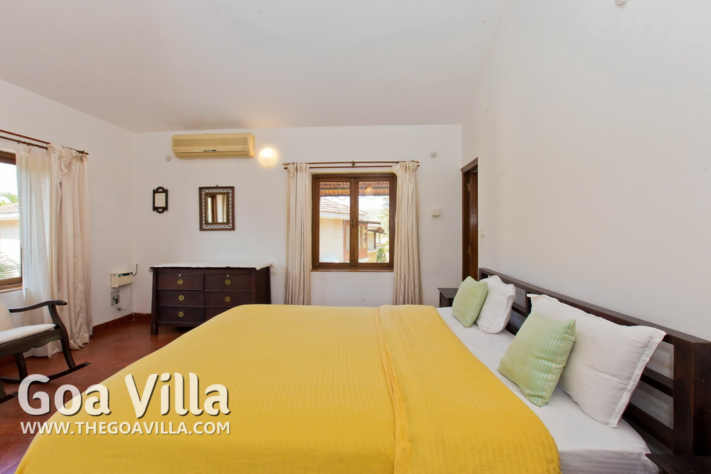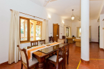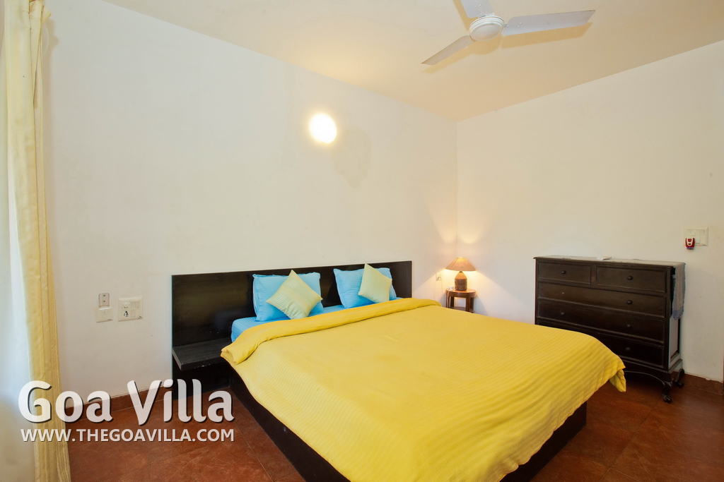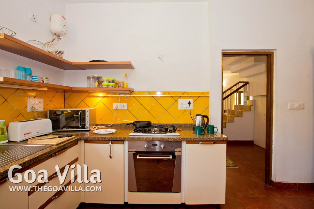 Kitchen, Dining – The dining area is at one side the living room beside a wide window. Glass-top table with sitting for 6 guests. This North Goa villa for rent also has a well equipped kitchen. You can use the large refrigerator, microwave, electric kettle, toaster, water purifier, and cooking station. Cutlery and cookware is provided.