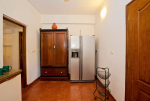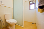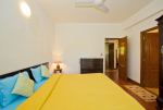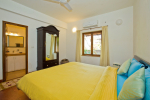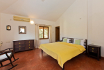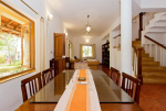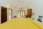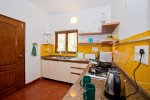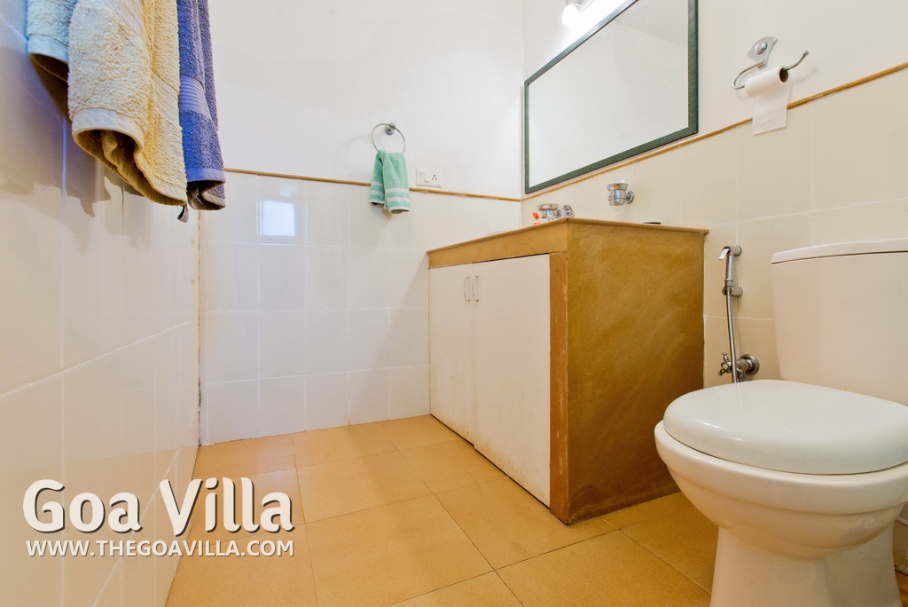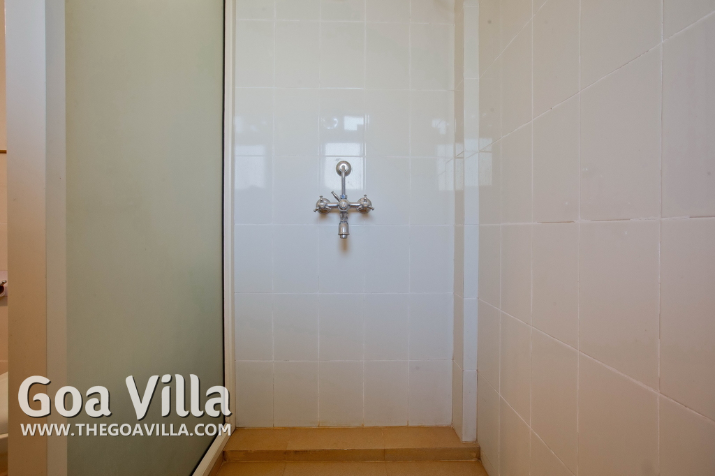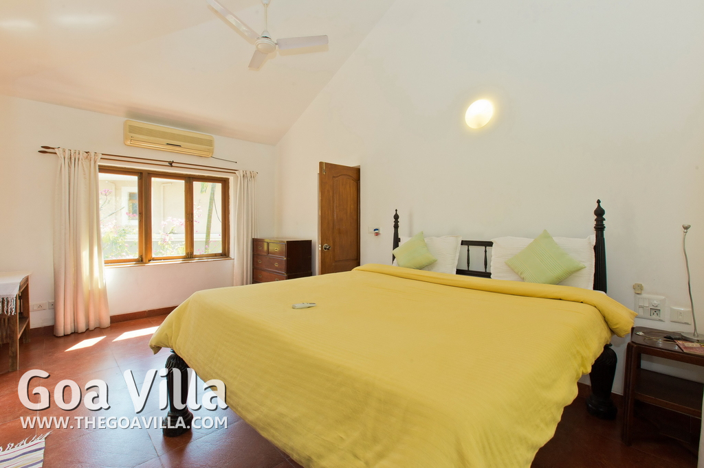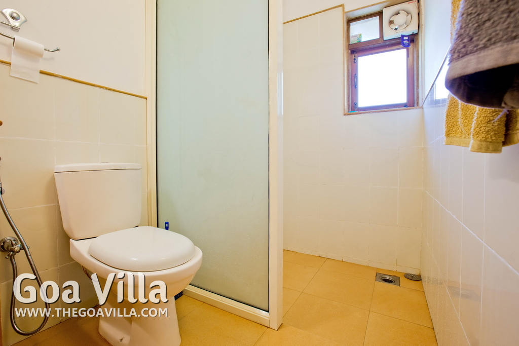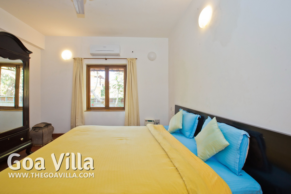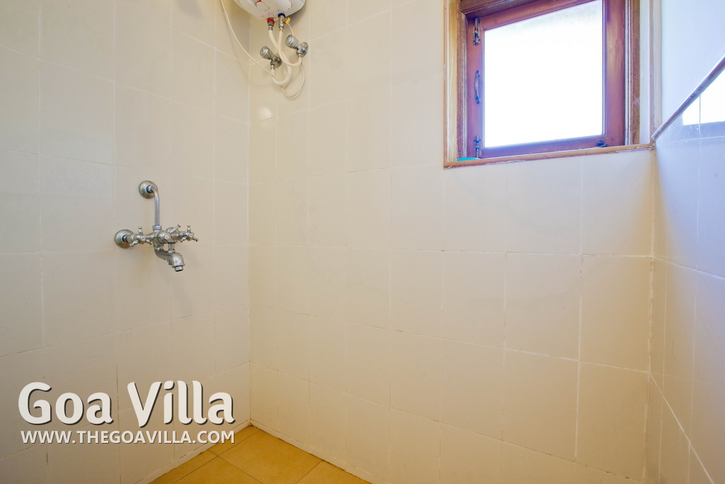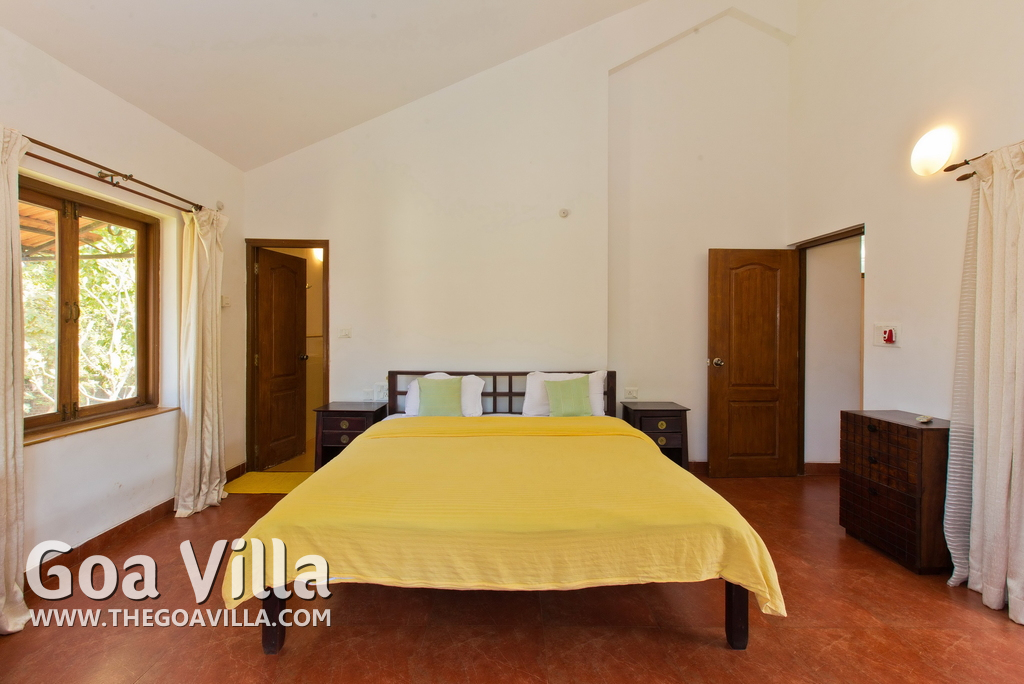 Kitchen, Dining – The dining area is at one side the living room beside a wide window. Glass-top table with sitting for 6 guests. This North Goa villa for rent also has a well equipped kitchen. You can use the large refrigerator, microwave, electric kettle, toaster, water purifier, and cooking station. Cutlery and cookware is provided.