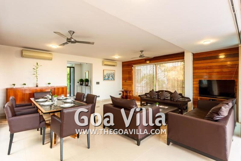 Living Room – The villa’s ground floor has an open-concept room with both the dining and living areas. The living room features several sofas, so the entire group can spend time together here. Make the most of your indoor time by watching a movie or your sports team in action. Play a board game with your kids or plan your various activities in Goa.