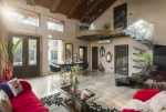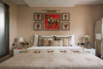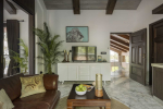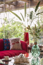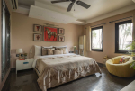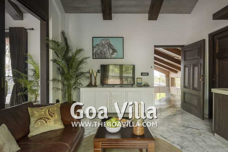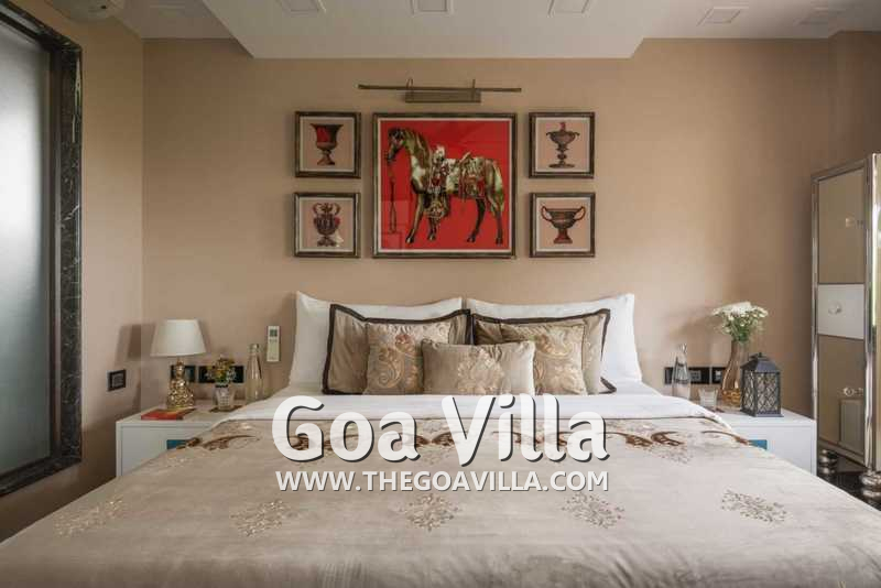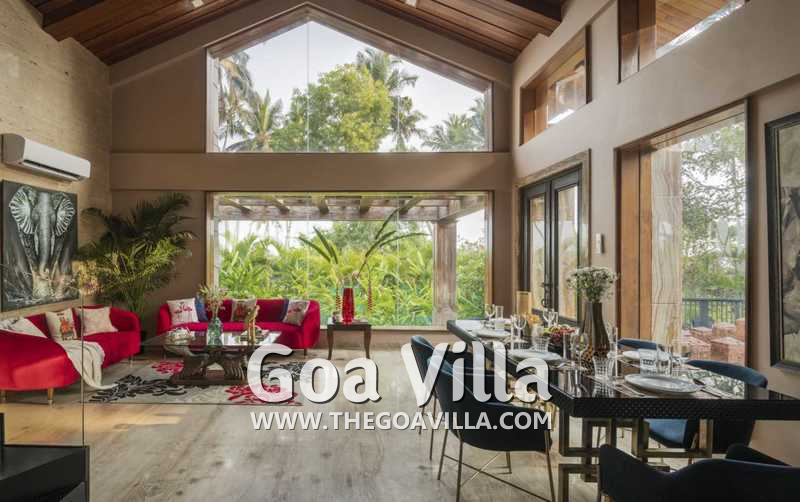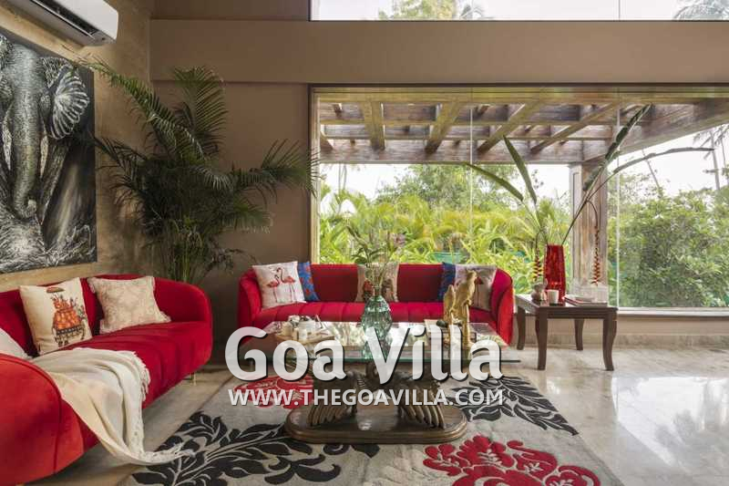 Living Room – On entering this North Goa villa, you will reach the impressive living room. It is a huge open-concept room with a large seating area. The earthly tone of the walls contrasts with the bright-red sofa. Indoor plants, paintings, and objects of art decorate the space. One entire wall has a glass panel that offers views of the garden. Windows on a second wall provides views of the pool and lawn.