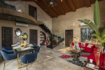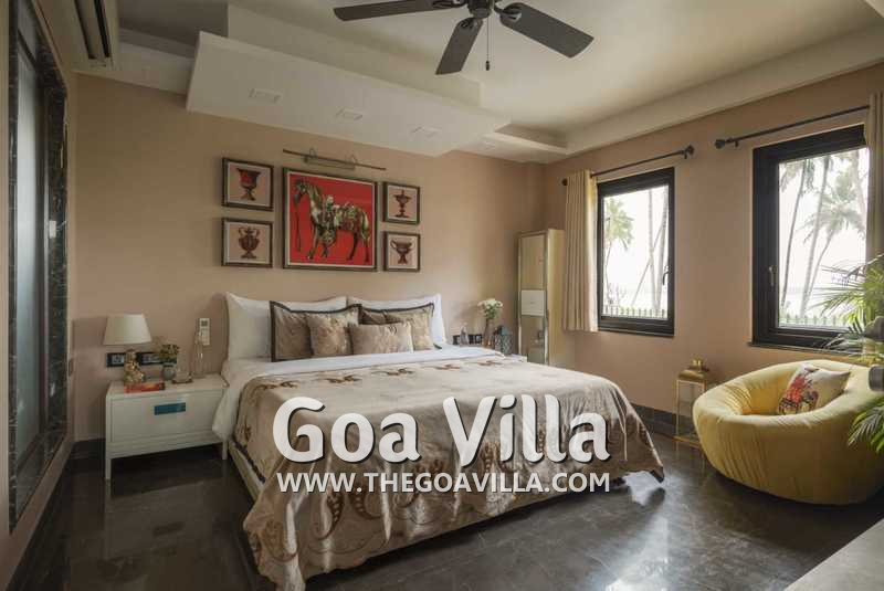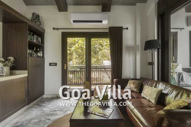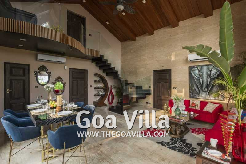 Dining, Kitchen – The formal dining table sits at one corner of the open-plan living/dining space. It is a 6-sitter table, so the entire group can have their meals together. A winding staircase goes to the upper floor, where you will find a small lounging area and a huge sea-facing balcony with a second informal dining area. This North Goa luxury villa also has a well-equipped kitchen with many appliances. You can cook yourself, order food from outside, or ask for the services of a chef. The upper floor has a small bar and a third lounging area with a sofa.