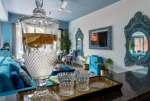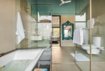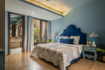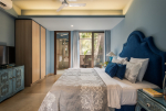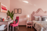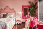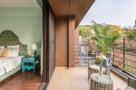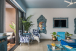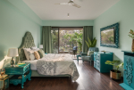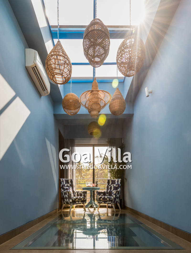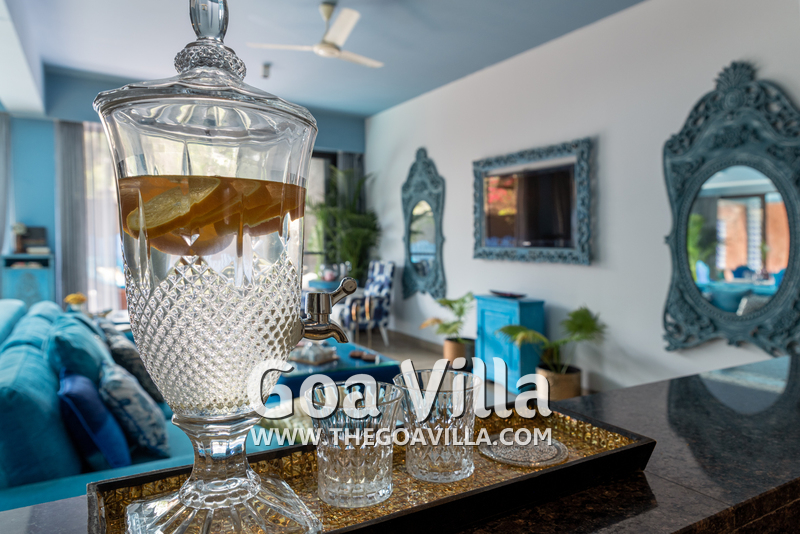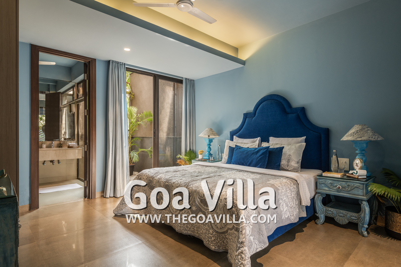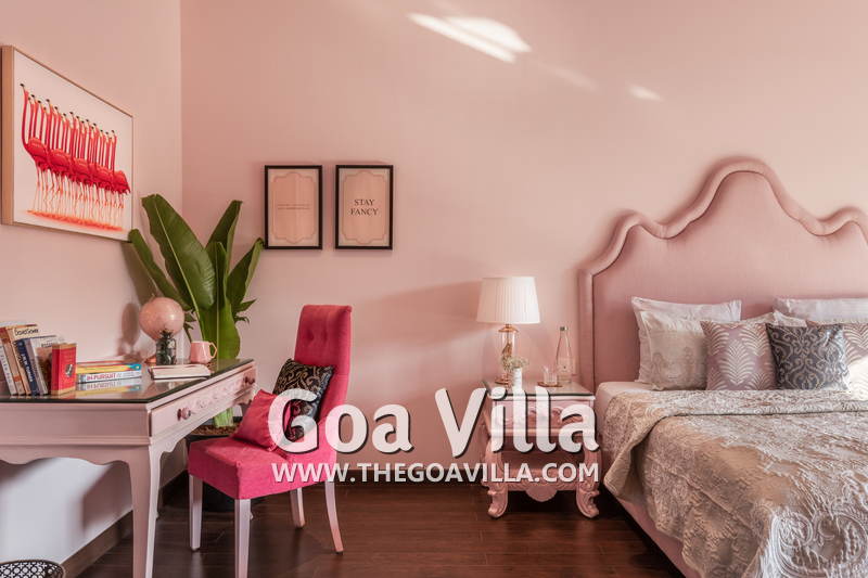 Bedrooms – The villa has three elegantly decorated bedrooms, each unique. The ground floor bedroom has a blue theme. The entire décor, including the bed, side tables, and lamp shades are in an elegant blue shade. It provides direct access to the swimming pool. There are two other bedrooms on the upper floor, one in pink and the second in green. All three bedrooms have large double beds. The upper floor bedrooms come with private balconies with seating areas.