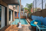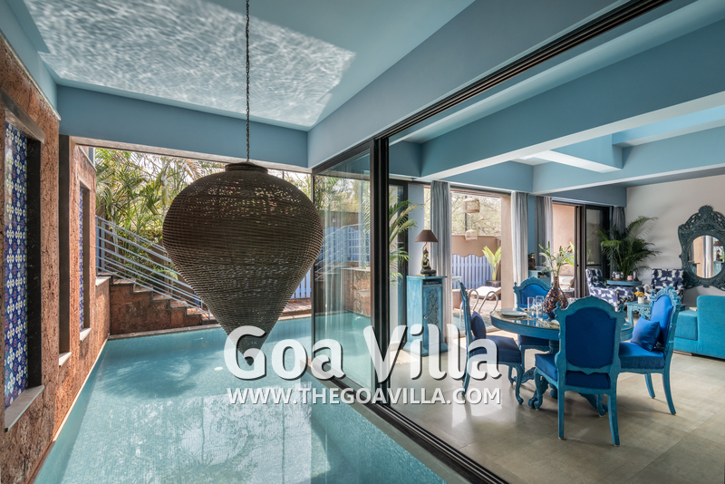 Swimming Pool – Guests staying in this North Goa villa will enjoy a private swimming pool, which is partly in the shade and partly under the sun. There is a wooden deck on one side with a couple of loungers and armchairs. You can sunbathe here and relax between your sessions in the water. The deck extends to a small staircase, which will take you to an outdoor lounging and dining area.
