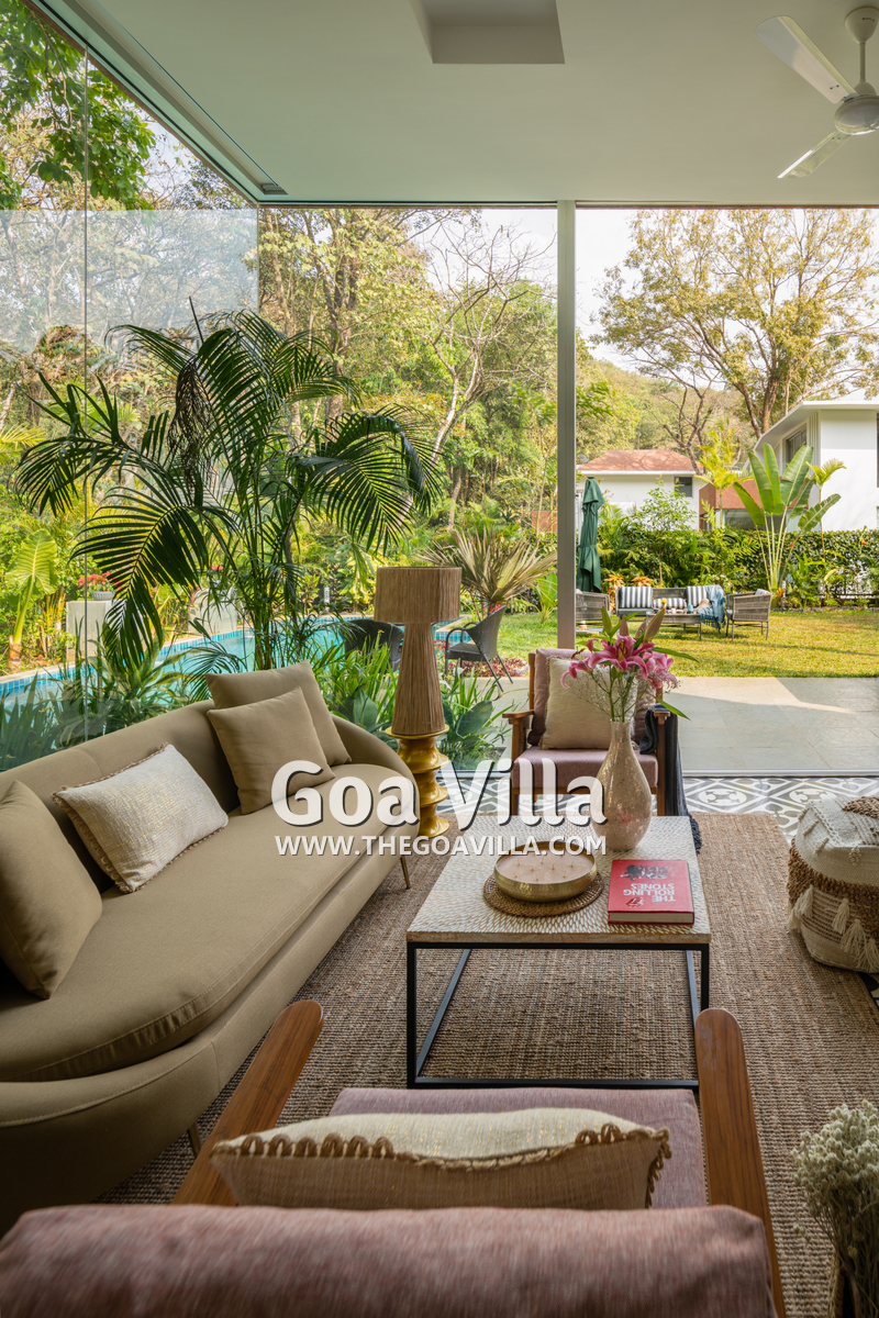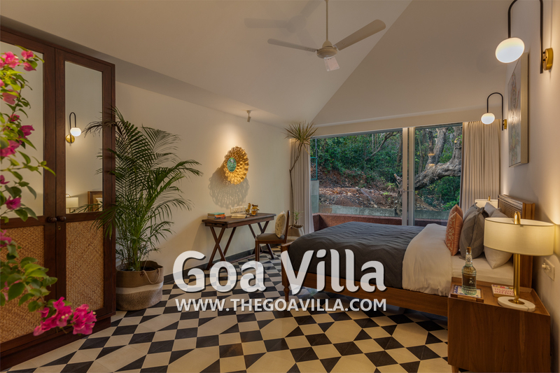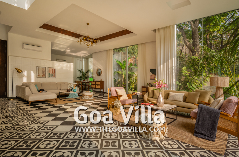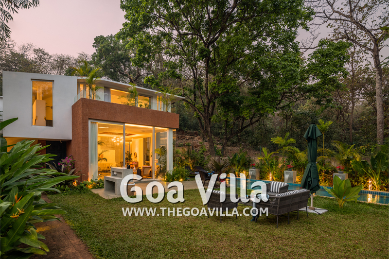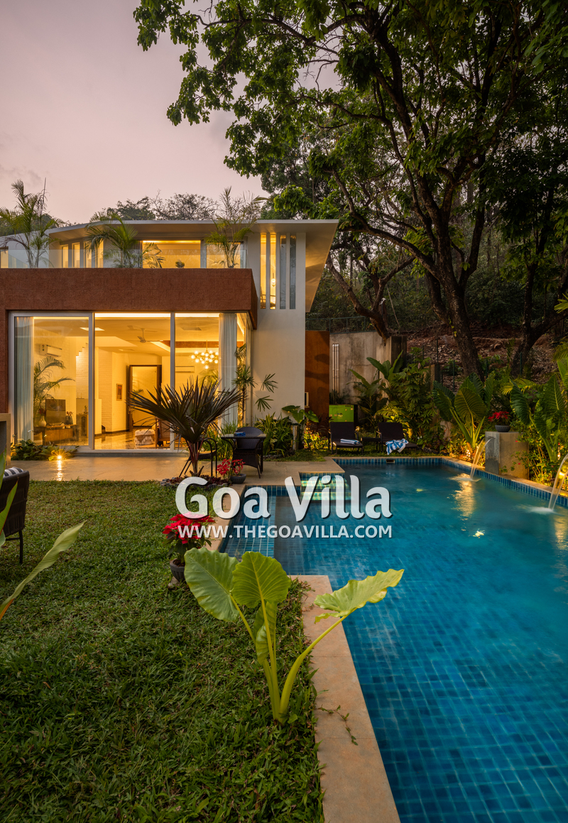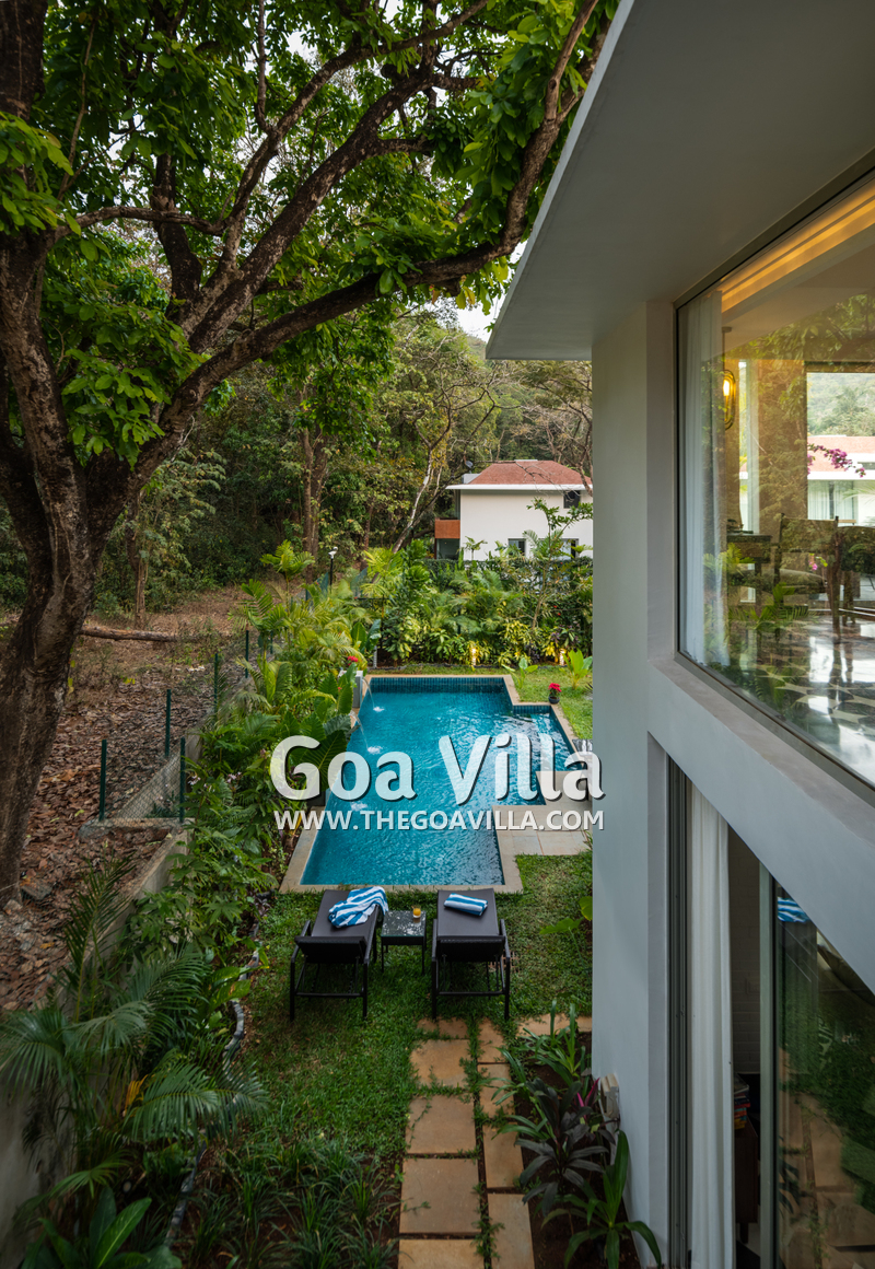 This luxury villa for rent is located next to a forested hill, which is called the Assagao Rainforest. It is beautiful and a popular hiking area in the neighborhood. Several beaches – Vagator, Anjuna, Morjim, and Ozran are an easy drive from this house. Even Baga Beach is nearby.