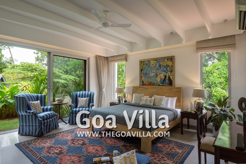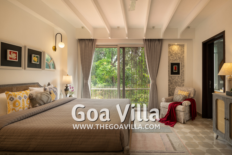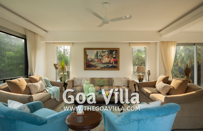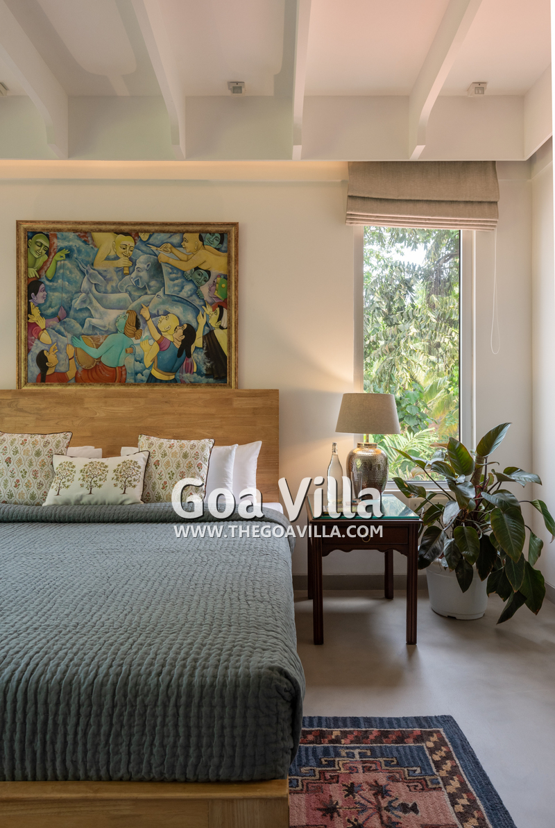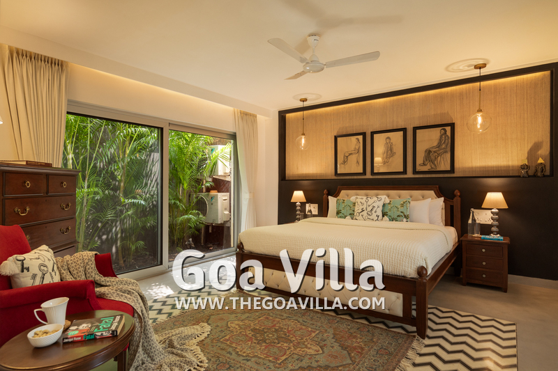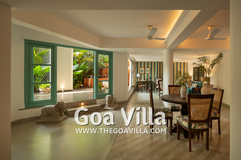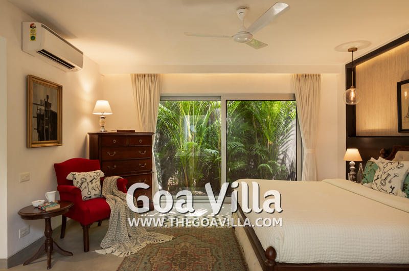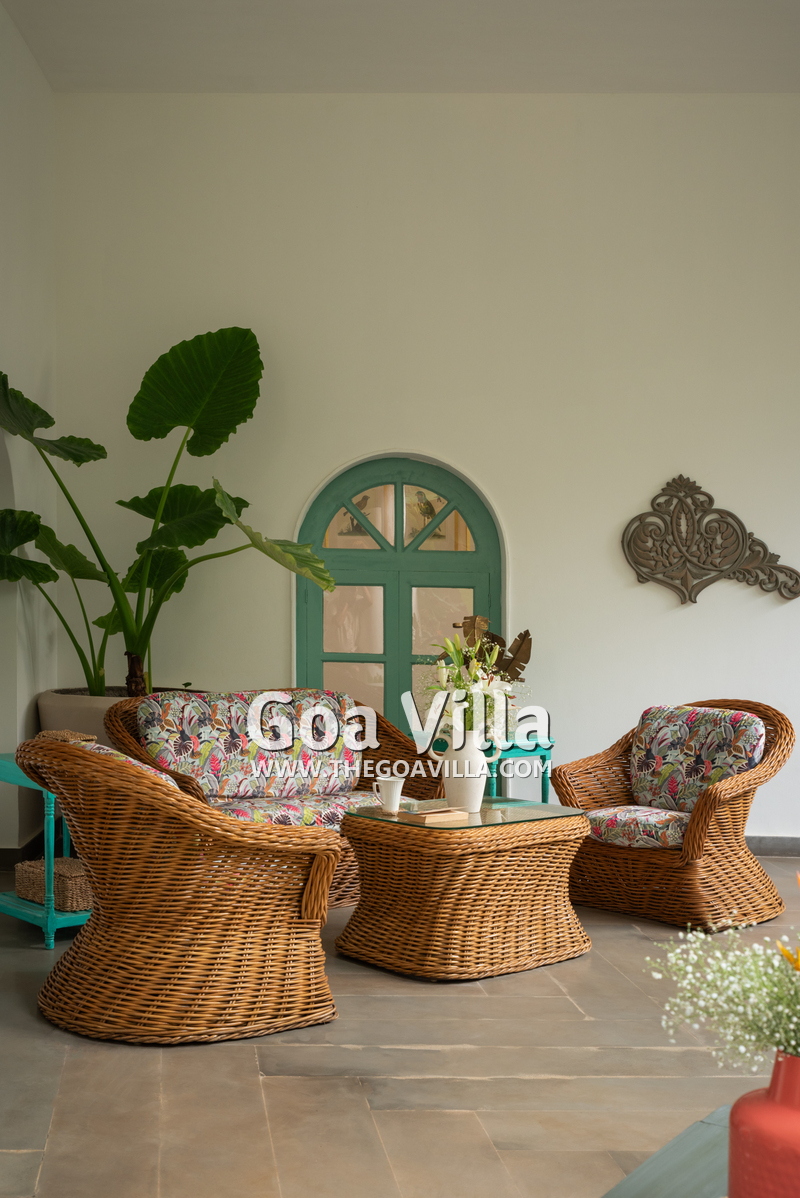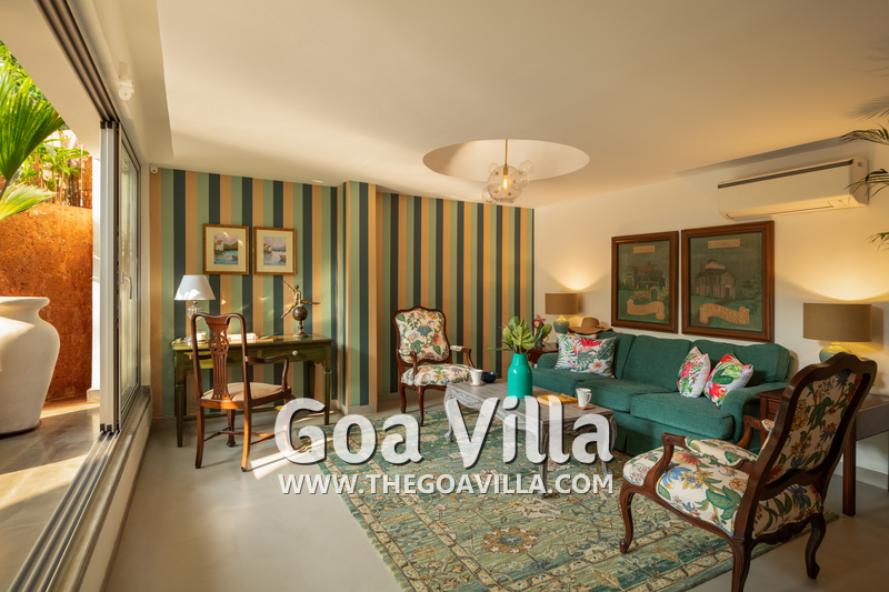Living Room – This North Goa villa has multiple lounging areas. The formal living room is huge. it has both modern and antique sofas, which can easily seat the entire group and also visiting friends. There is a glass-top coffee table. Paintings decorate the walls. The room has several glass panels, providing green views. A second lounging area is cozier. It has a sofa and a bright-colored armchair. There is a third place, also with a sofa, work desk, and a beautiful rug.