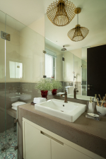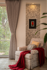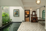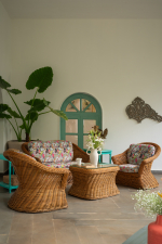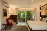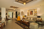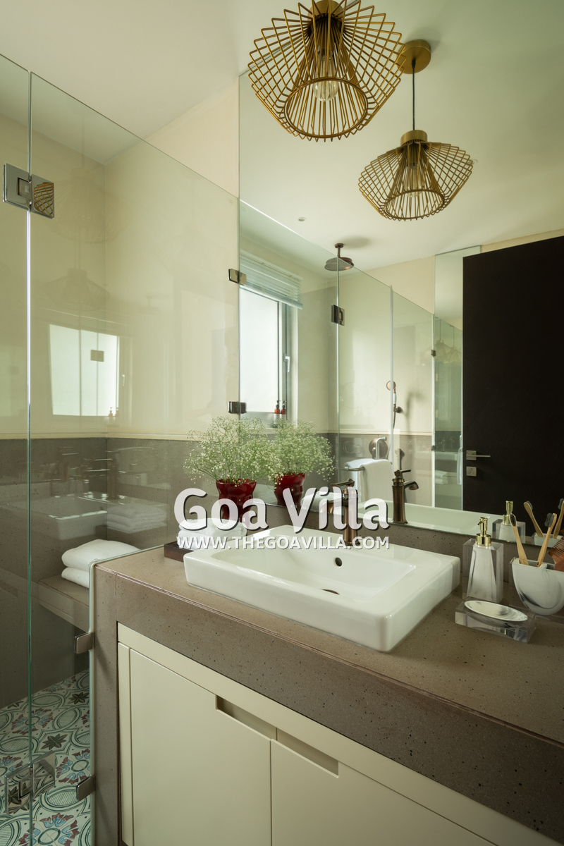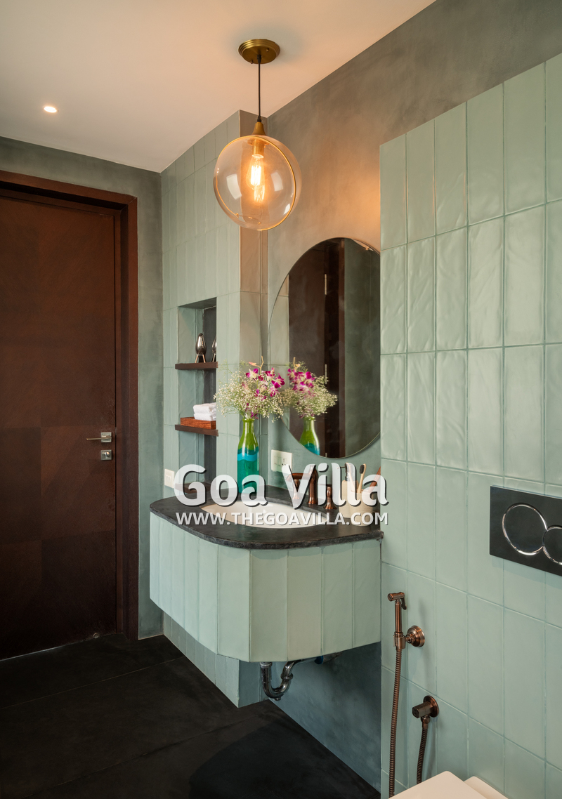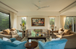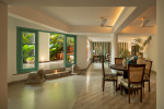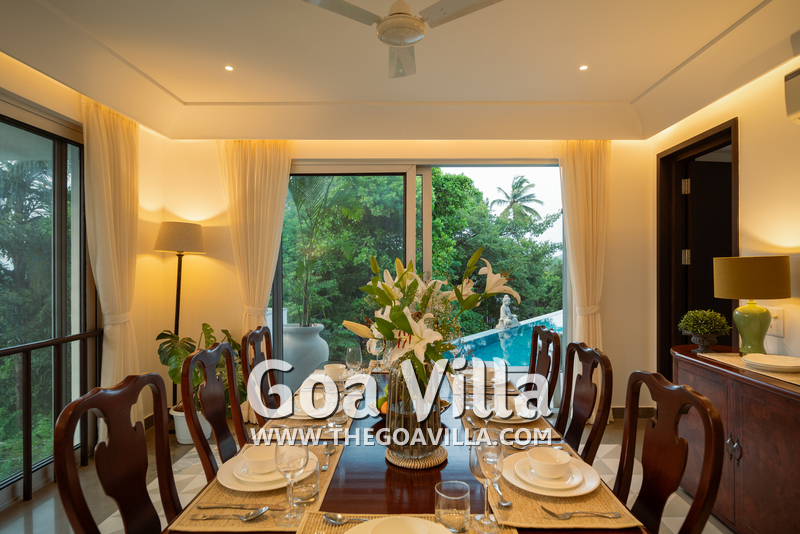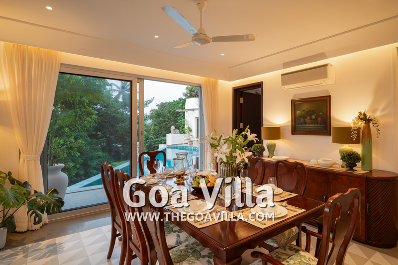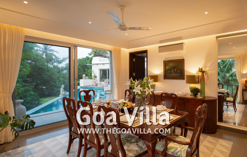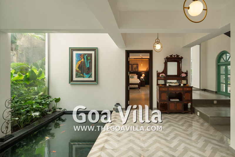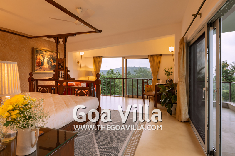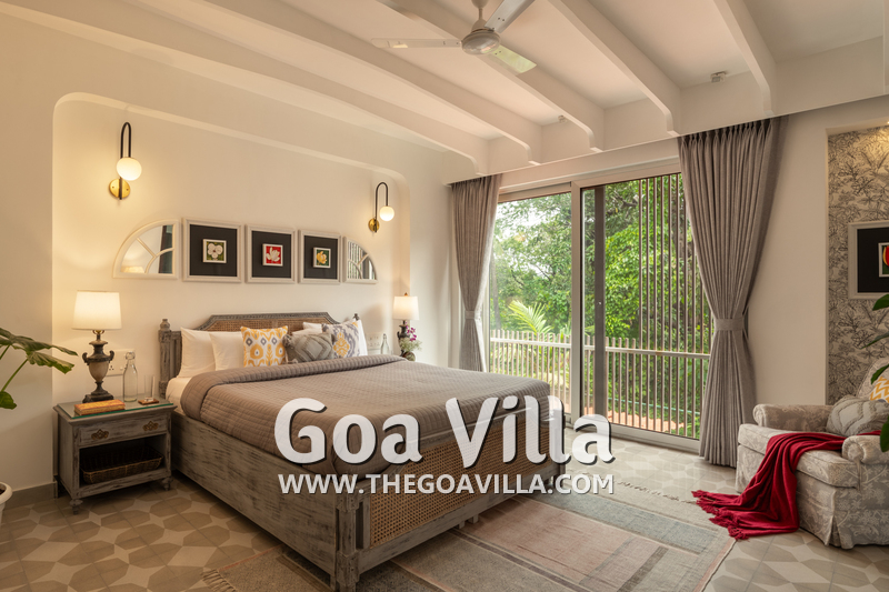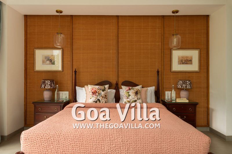 Living Room – This North Goa villa has multiple lounging areas. The formal living room is huge. it has both modern and antique sofas, which can easily seat the entire group and also visiting friends. There is a glass-top coffee table. Paintings decorate the walls. The room has several glass panels, providing green views. A second lounging area is cozier. It has a sofa and a bright-colored armchair. There is a third place, also with a sofa, work desk, and a beautiful rug.
