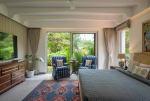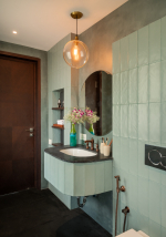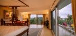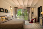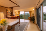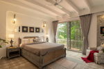 Bedrooms – The house has 5 bedrooms that can easily sleep 10 guests. They are spread over two floors. Each bedroom is a work of art, seamlessly blending rustic touches with modern comforts. There are large wardrobes, armchairs, coffee tables, bedside tables with reading lights, dressing areas, makeup mirrors, and potted plants. The ground floor bedrooms have huge glass sliding doors opening to private sections of the lawn, which seems like a part of the room. The upper floor bedrooms come with balconies with seating areas. You will get panoramic views of the hills, forest, sea, and the river. The view is super impressive.