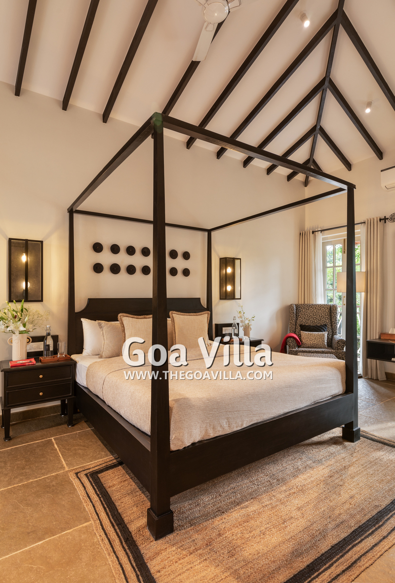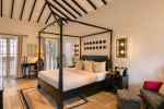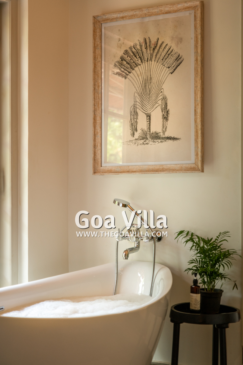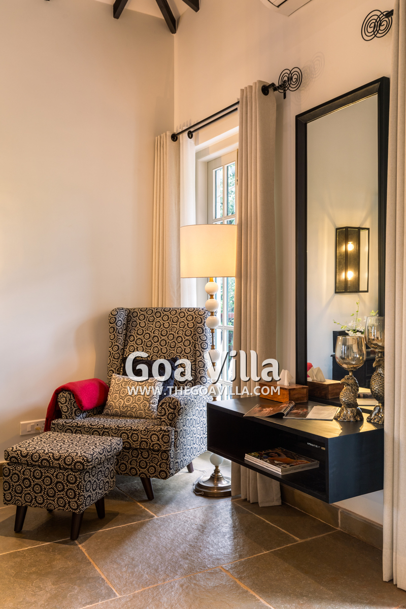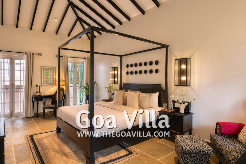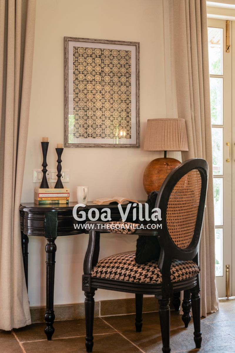 Bedrooms – The villa’s three bedrooms are spread over two floors. The first bedroom, on the ground floor, has a private outdoor terrace. It is close to the pool and the common areas. The other two are both on the upper level. The second bedroom has a wraparound balcony with two doors opening to it. The third bedroom has an antique four-poster bed. The clean and uncluttered walls together with the high-quality mattresses will help you sleep better. All three bedrooms have large double beds with extra pillows, wardrobes, study tables, armchairs, and dressing areas.