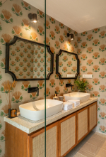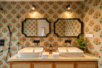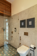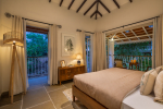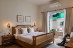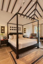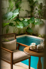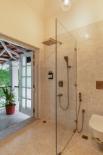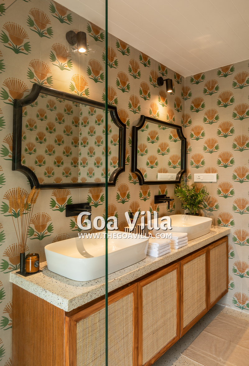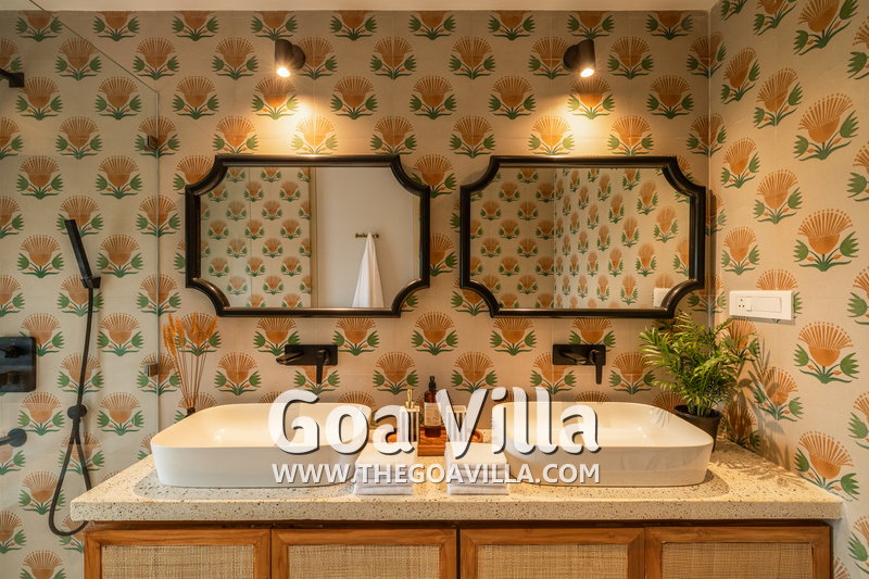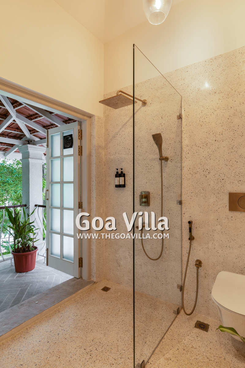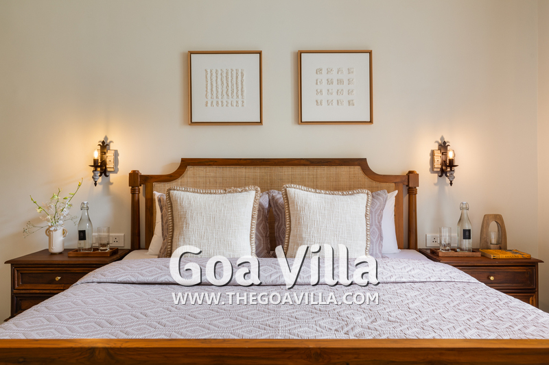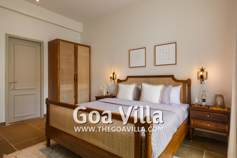 Bedrooms – The villa’s three bedrooms are spread over two floors. The first bedroom, on the ground floor, has a private outdoor terrace. It is close to the pool and the common areas. The other two are both on the upper level. The second bedroom has a wraparound balcony with two doors opening to it. The third bedroom has an antique four-poster bed. The clean and uncluttered walls together with the high-quality mattresses will help you sleep better. All three bedrooms have large double beds with extra pillows, wardrobes, study tables, armchairs, and dressing areas.