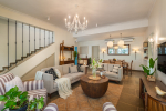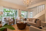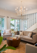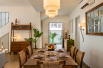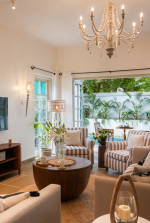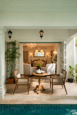 Living Room – The ground floor living room is the place to relax, unwind, and spend quality time with the family or friends. It has two sofas and a unique coffee table that is carved from the trunk of a large tree. Furniture pieces are sleek and straightforward, with a minimalist feel. Color palettes are light and neutral, with splashes of color to make the home feel inviting. A beautiful chandelier hangs from the ceiling. The living room also has a wide-screen television and music system for your entertainment. The staircase leads to the first floor. A French door opens to the swimming pool and small garden.