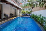 Swimming Pool – The first thing that will catch your eye on entering the estate is the tropical-style garden where there are many plants. It sits in a pretty corner of the estate next to the rice fields and plantations. There is also a small lawn with many loungers where you can spread out and relax. And at the center, there is a swimming pool just for your use. Steps lead down gently into the pool. On one side, you will find a relaxation area with a sofa and chairs. More chairs are placed under the shaded verandah.