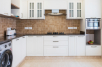 Dining, Kitchen – The dining table is placed in a corner of the open-plan living/dining room. The table seats all eight guests. In the kitchen, you will find a refrigerator, toaster, electric kettle, microwave, and washing machine. Cups, plates, and glasses are provided. Breakfast will be served to the guests every day.