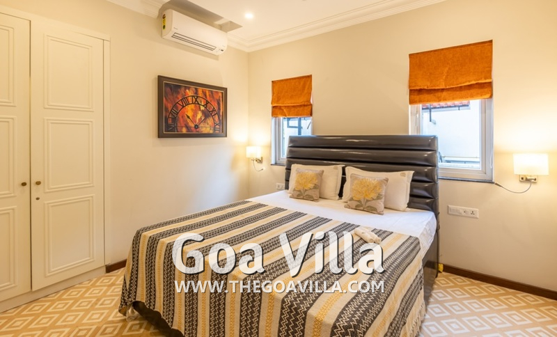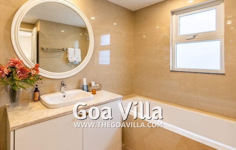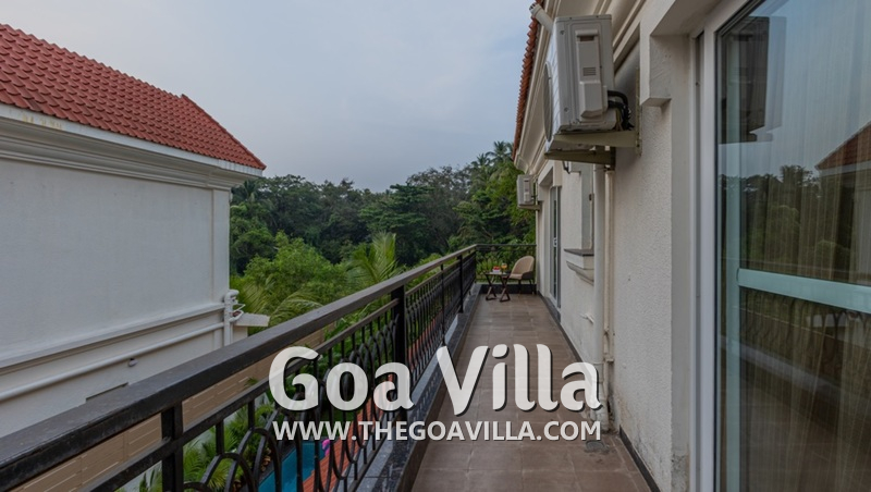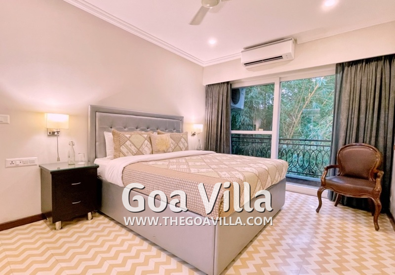 A lavish country home in the countryside of Goa awaits your arrival. Welcome to Villa Serene Harmony 9. It is a 4-bedroom luxury villa for rent in North Goa’s Saligao neighborhood, which is very close to Calangute. The house has a private swimming pool, a beautiful garden and lawn, air-conditioned interiors, bathrooms with tubs, a modern kitchen, a balcony offering fabulous views, and everything you need for a relaxing and enjoyable stay. It is fully ready for your luxury and convenience. And on top of that, you will have complete privacy here, unlike large hotels and resorts.
