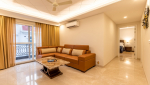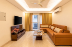 Living Room – The ground floor features a huge living room with two sofa arrangements. Both the areas have plush sofas with cushions and two center tables, offering plenty of sitting space for a large group. There is also a bench besides the staircase that leads to the upper floor. On the first floor, you will find a TV lounge with a sofa facing the television. A door opens to the long balcony.