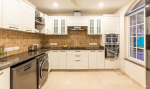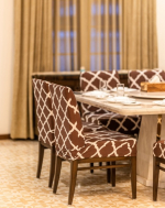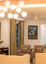 Dining, Kitchen – You will find the dining table to your left on entering the house. It is a modern dining table with 8 chairs. This room has an open-plan design with the lounging area a few steps away. A beautiful chandelier hangs between the dining and lounging sections. The kitchen is located strategically on the opposite side of the dining table. It has a refrigerator, oven, hob, microwave, electric kettle, toaster, and washing machine.