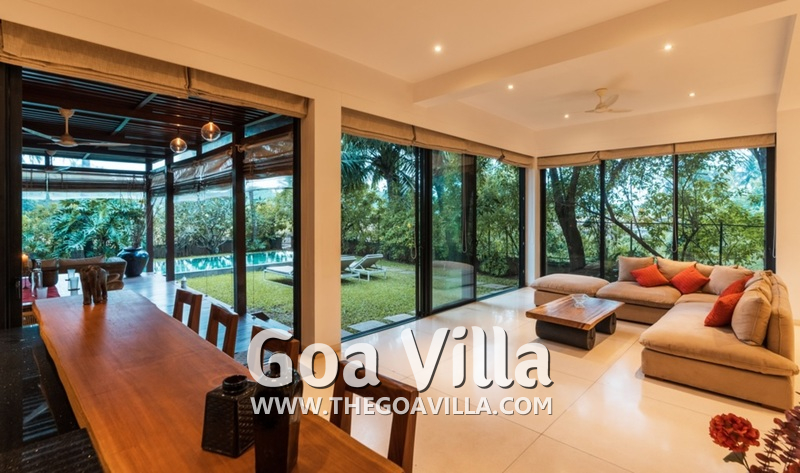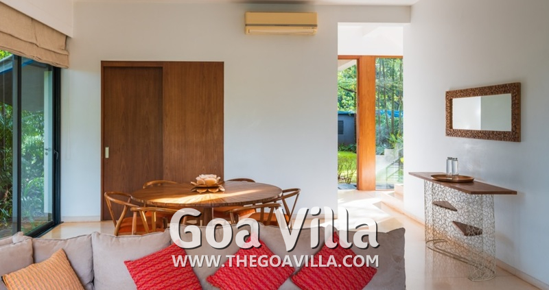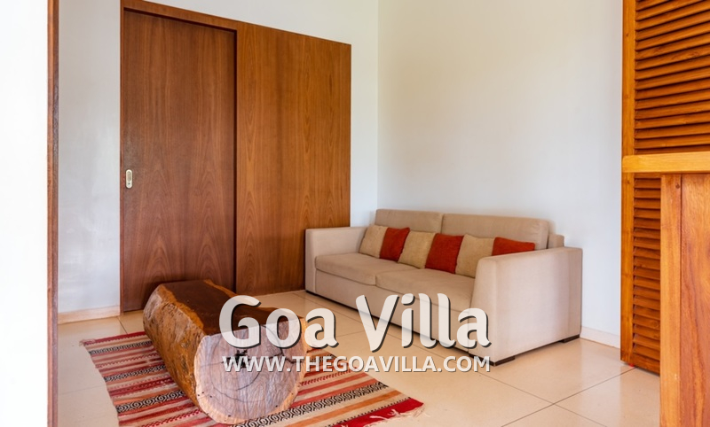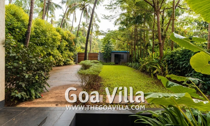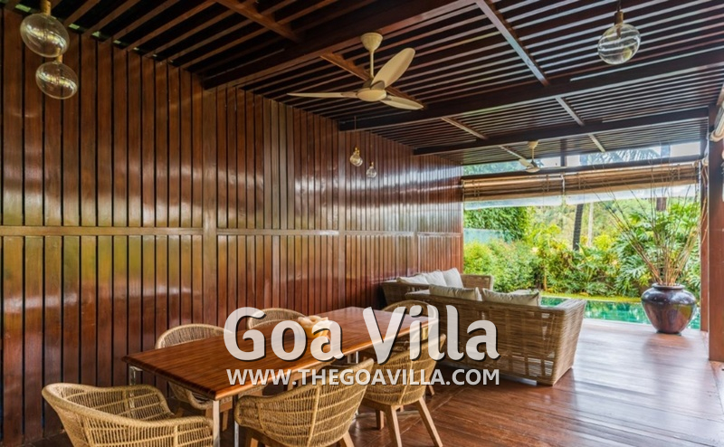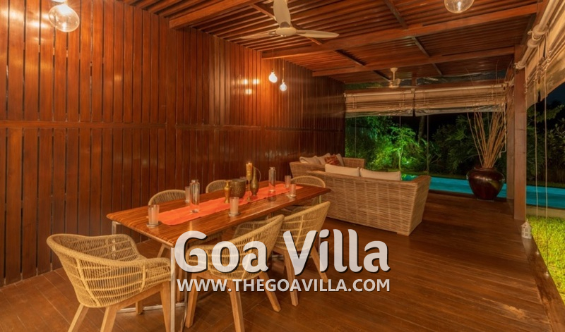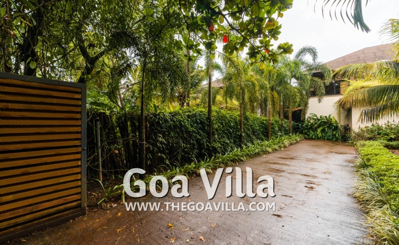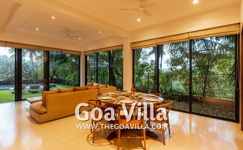 Swimming Pool – Outside, this luxury villa in Anjuna has a manicured lawn where you can lie back and relax. You will also see many tall trees. Several loungers are also placed on the lawn where you can relax before and after a session on the pool. At the center of the lawn, you will find a large swimming pool, which will be exclusively for your group. The small Baga River flows quietly just outside.