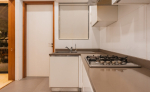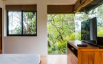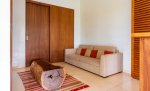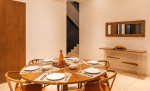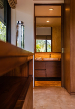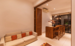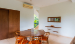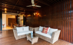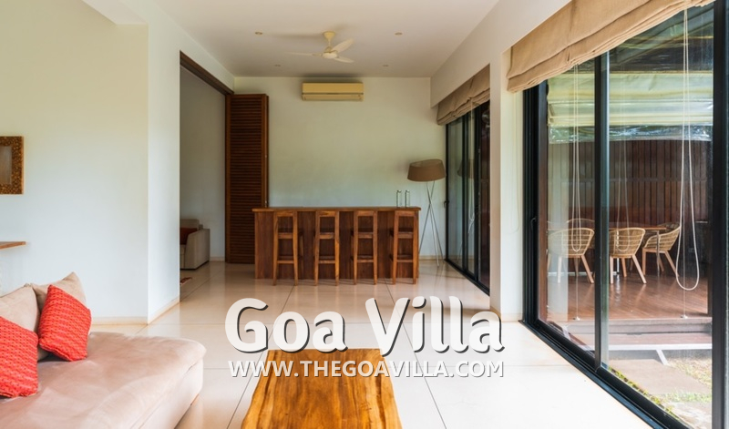Dining, Kitchen – The house has two dining areas. The first is behind the living room sofa and the second is located on the wooden platform. They can both seat the entire group. Separately, there is a bar with a seating area and a sound system. A folding louvered door can cut-off this section from the rest of the house if you want. The modular kitchen has an oven, hob, refrigerator, freezer, and many utensils.