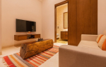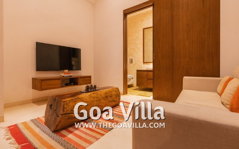 Living Room – The ground-floor living room is huge. It features an L-shaped cushy sofa facing the impressive lawn and pool area. Ceiling-to-floor glass provides you beautiful views. A glass door opens to the outdoors. There is a second lounging space in an extension of this room that protrudes towards the pool. It has a cane sofa and a glass-top coffee table. This part of the house provides an even better view. Unique in construction, it is on a wooden platform with no doors and windows. Both sides remain open. The only way to keep it closed is through a blackout curtain. There is also a media room with a 55-inch LED TV with many OTT platforms.