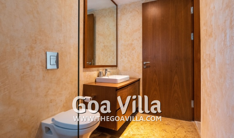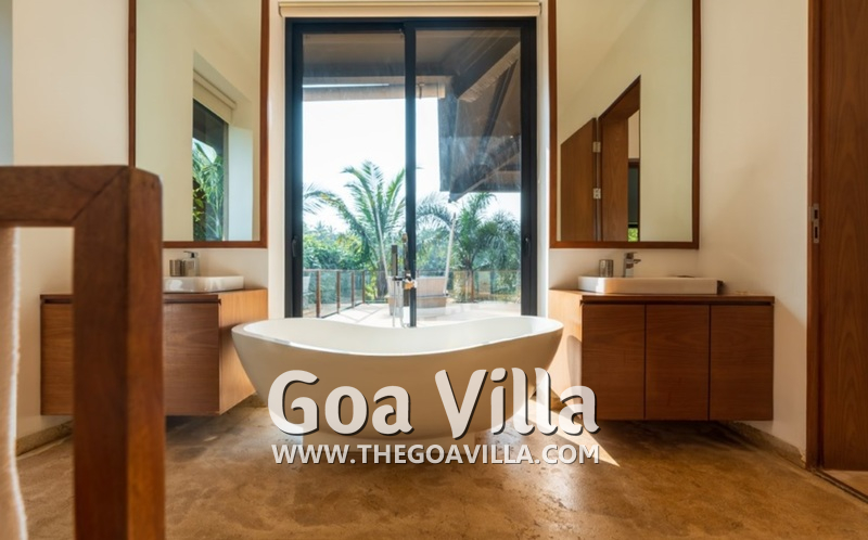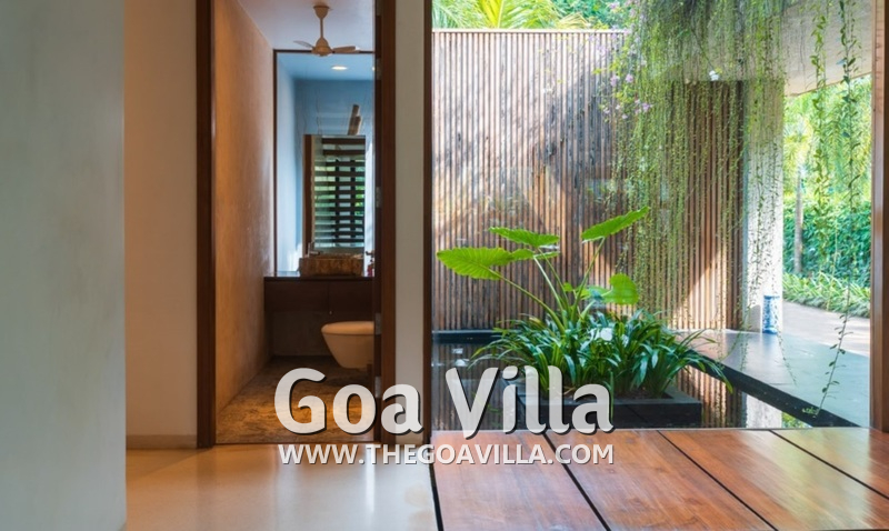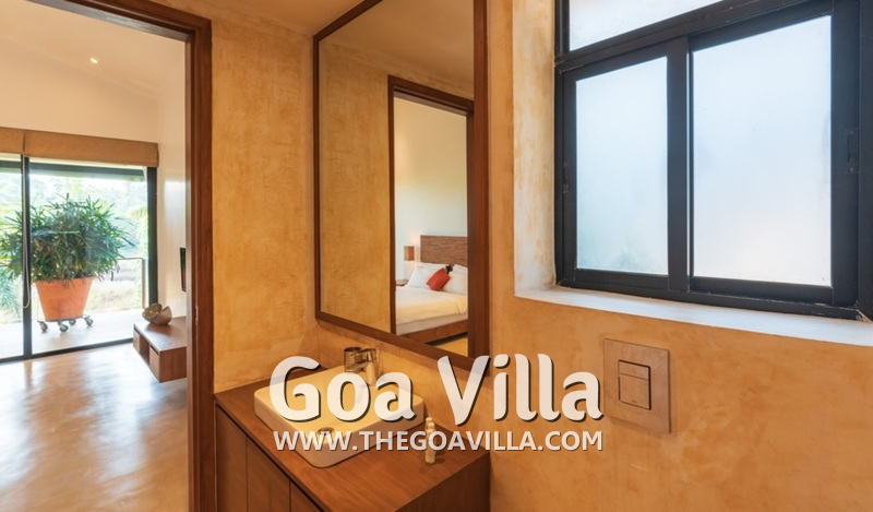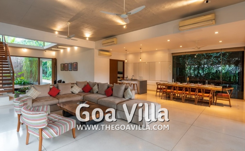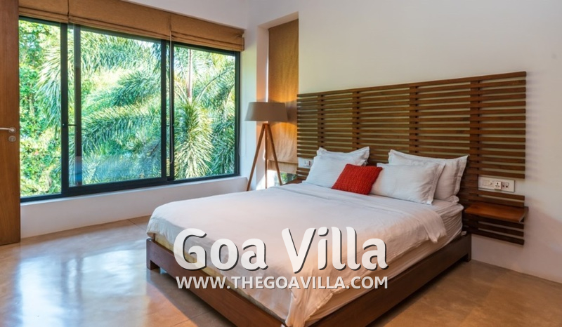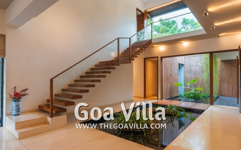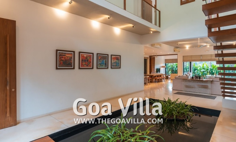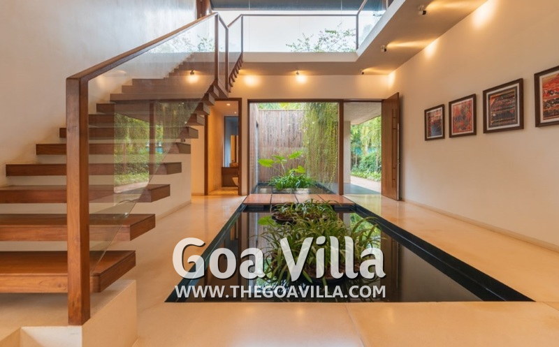 This holiday villa for rent is located in North Goa’s Anjuna neighborhood. It sits away from the beach besides the small Baga River. It is a very quiet and peaceful area. A forested hill rises at the backside of this luxury holiday villa. Both the Baga and Anjuna beaches are close. Nearby, you will find many other attractions that are popular with the tourists.
