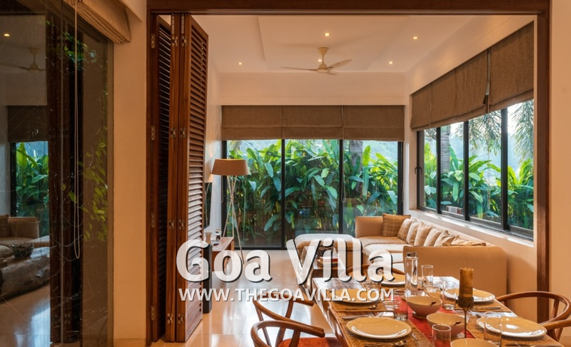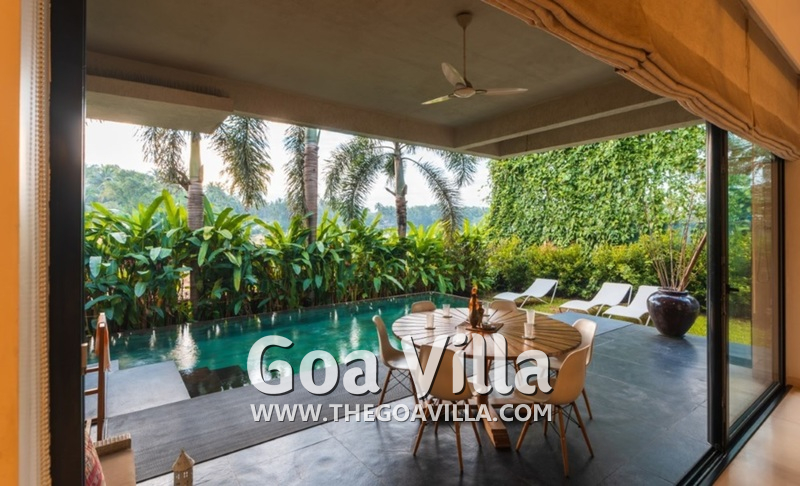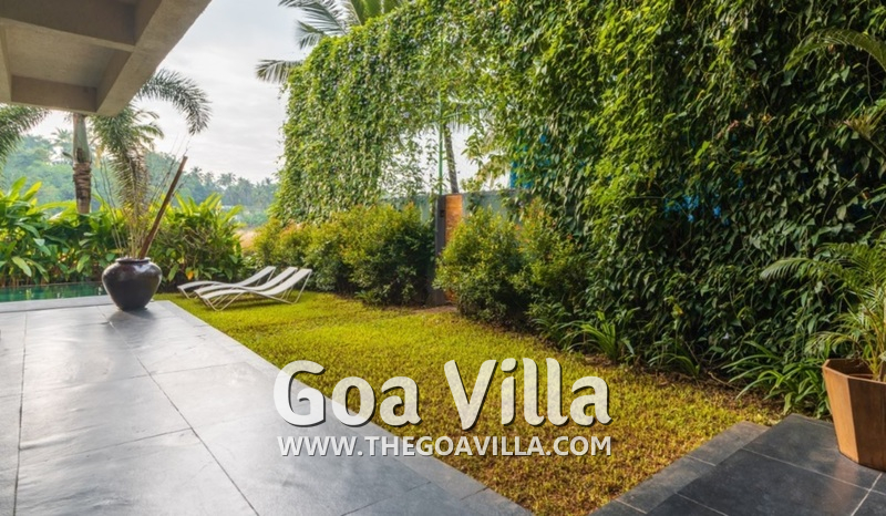 Swimming Pool – The impressive outdoor area of this luxury villa for rent is extremely popular with the guests. It has a private pool and a manicured lawn. You will find many tall trees. The pool deck has an outdoor dining table. Several loungers are placed in the garden. The Baga River flows behind a line of trees.