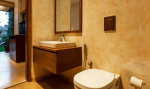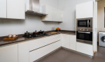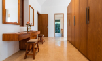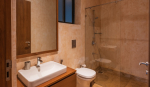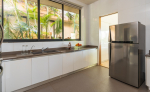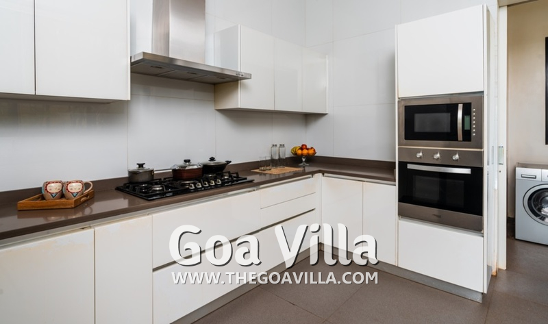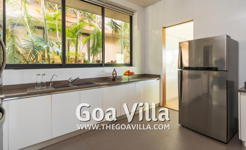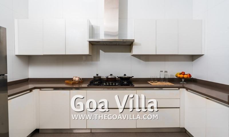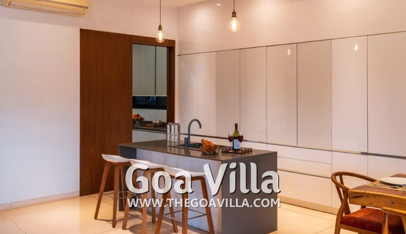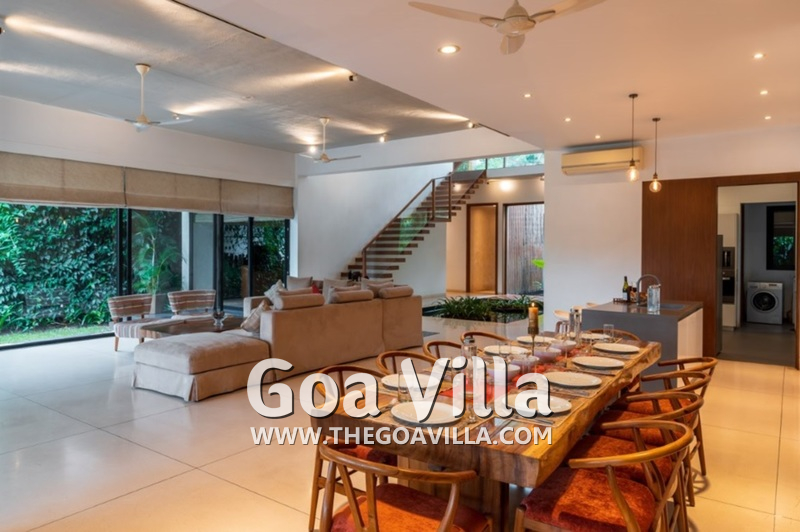 Dining, Kitchen – The formal dining area is in one corner of the open-plan living/dining space. It has an elegant wooden table with 10 chairs. So, the entire family can sit together for their meals. The modular kitchen on the same level has many appliances. Cups, plates, and glasses are provided. On request, the villa can stock-up the kitchen. There is an in-house chef.
