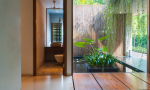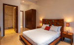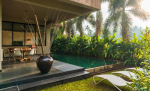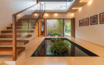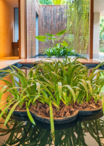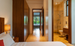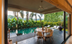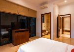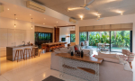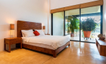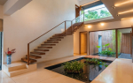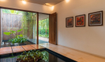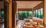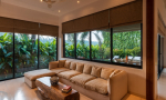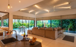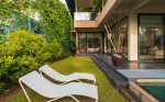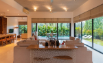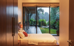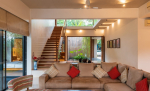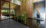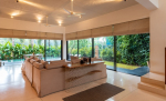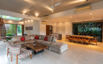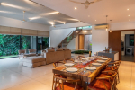 Living Room – The villa has a huge living room with many armchairs, a cushy sofas, and modern coffee table with a centerpiece. The room’s end-to-end glass sliding windows and doors exhibit lush, green views. Two walls of this room are made entirely of glass, allowing natural light to flood the space. There is a beautiful water feature below the staircase with an island having plants. You will also find a bar with high chairs. Steps away from the lounging space, you will find a media room having a large-screen television and a cushy sofa facing it. Then there is also the terrace, which has a day bed and armchairs. It is a great place for sunset views.
