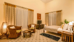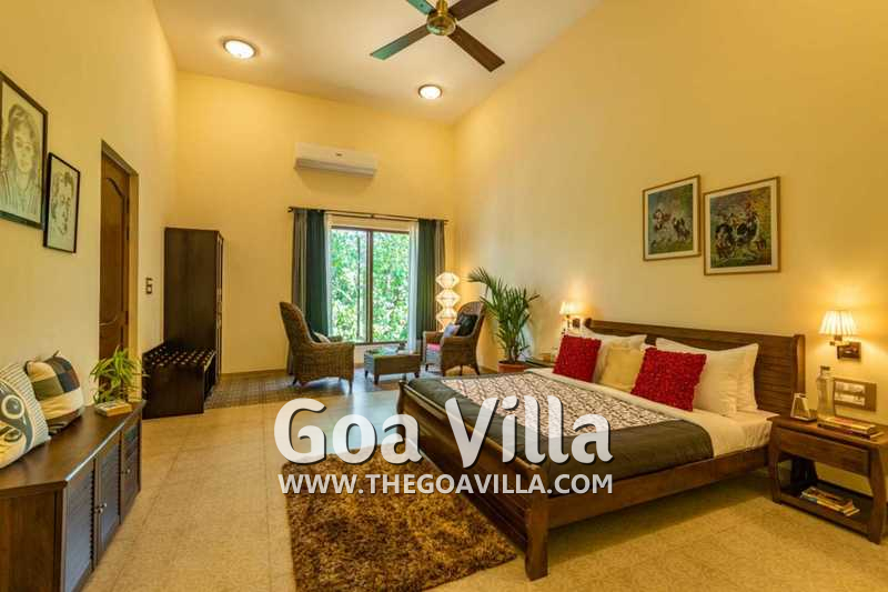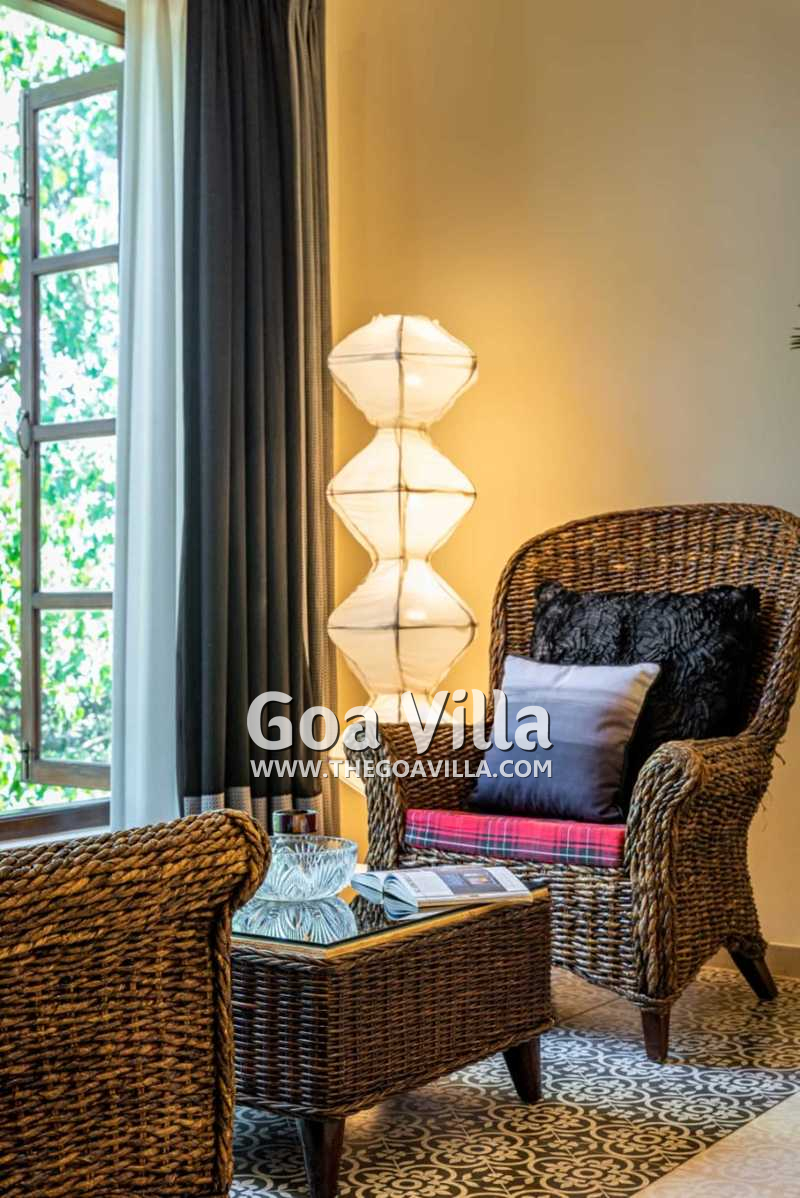 Living Room – The ground-floor living room is super comfortable. It is a large space with cane sofas, armchairs, and coffee tables. There are two different sofa arrangements, which means that the entire group can relax here, spend quality time together, and plan what to see and do in Goa. The room has two doors. The first takes you into the space from the parking area and the second to an outdoor lounging area next to the river.