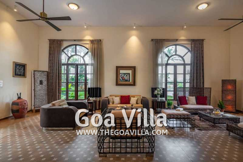 Aptly named “The Mansion”, this is a massive 8-bedroom luxury villa for rent in North Goa. Everything is super large and super comfortable here, from the living room to the kitchen, bathrooms, and the 8 huge bedrooms that can easily sleep up to 16 guests. The villa is spread over a massive private estate overlooking the Nerul River. Its best feature is the riverside lounging and relaxing area. It features a private pool, a pool table, and a beautiful lawn with many tall trees providing natural shade. Relax by the riverside and enjoy the soothing breeze and stunning nature views. Inside, you will have every modern amenity that you get in 5-star resorts.