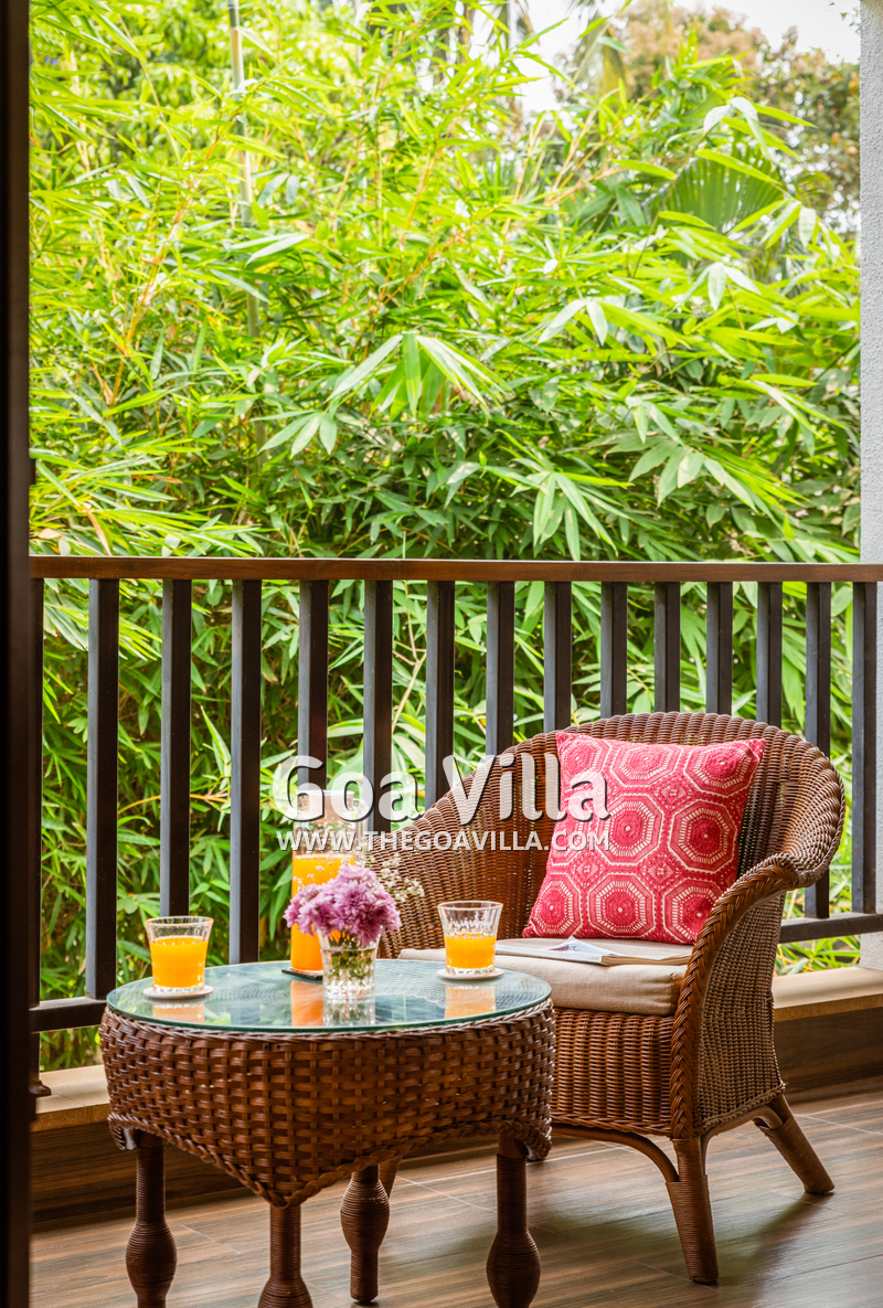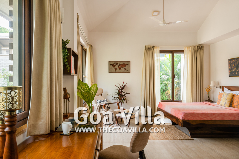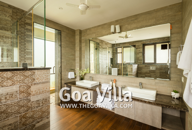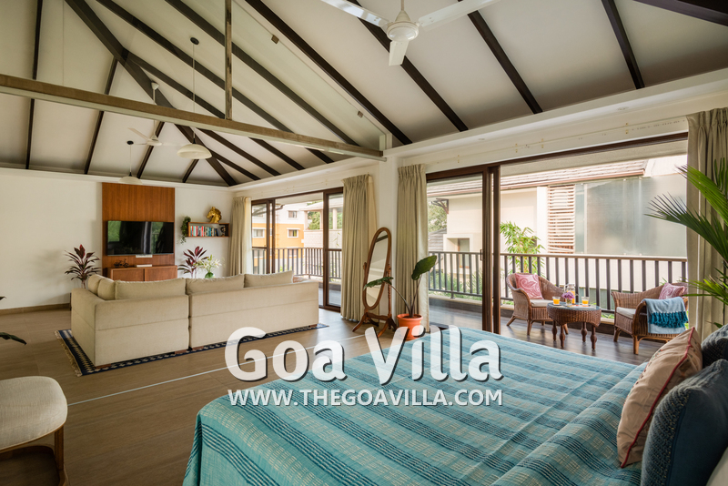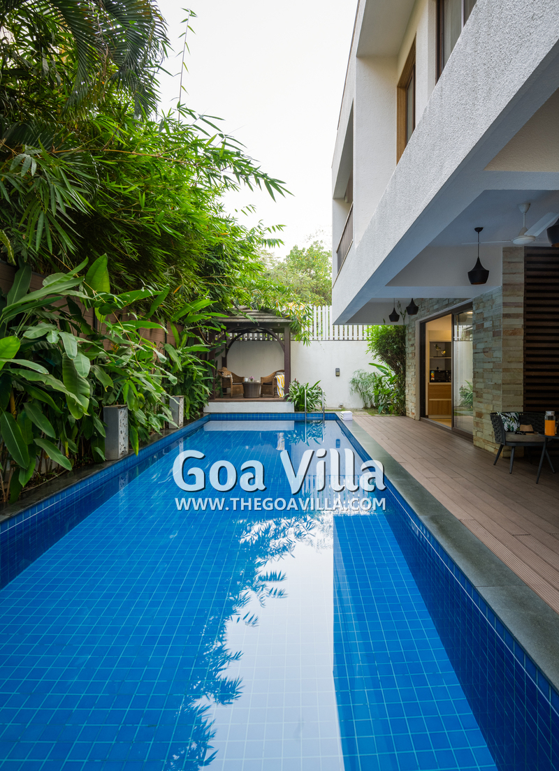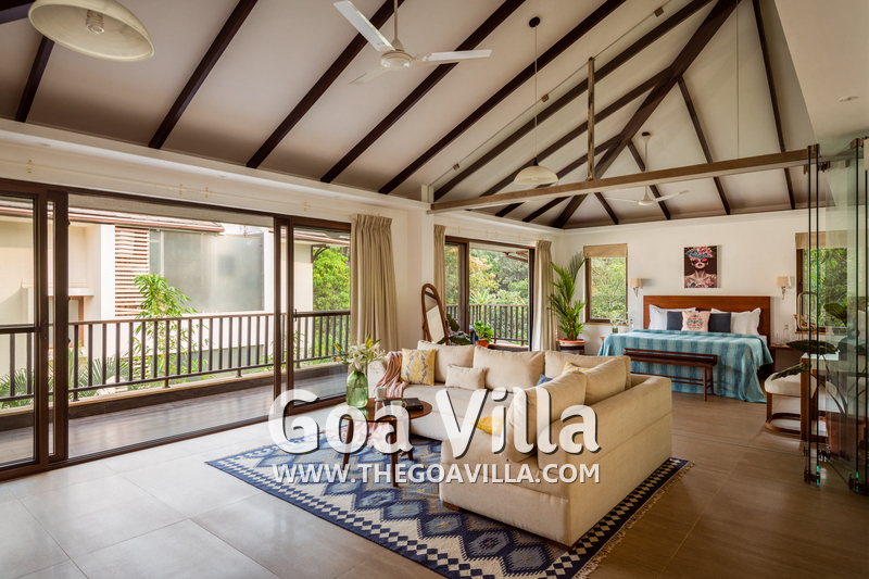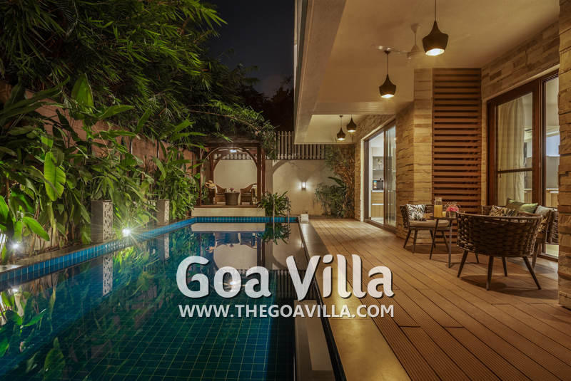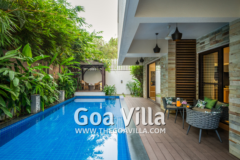 Swimming Pool – The villa treats you to sweeping panoramic views of Goa’s landscape. There is so much greenery all around that it feels like a nature reserve. A star attraction is the private swimming pool, which is placed within this greenery. You can swim anytime you want. The wooden terrace has an open-air cabana with armchairs. There is also an outdoor drencher shower and a small dining area.