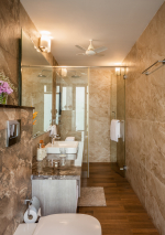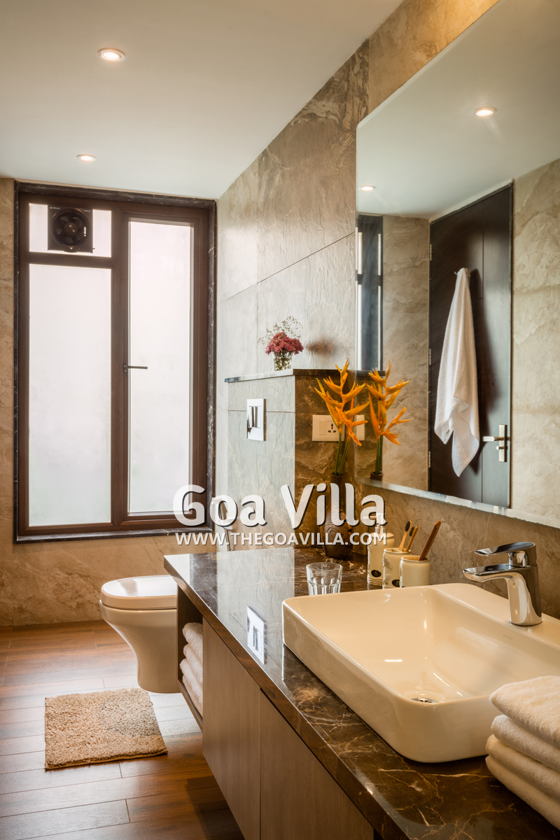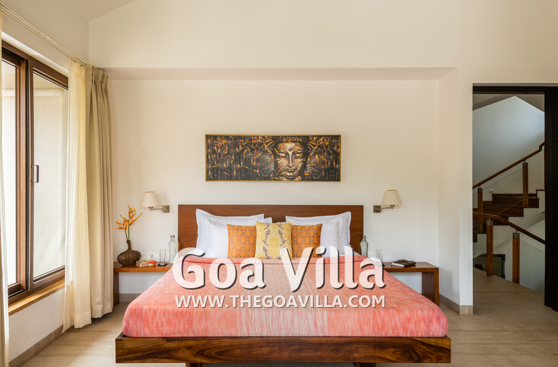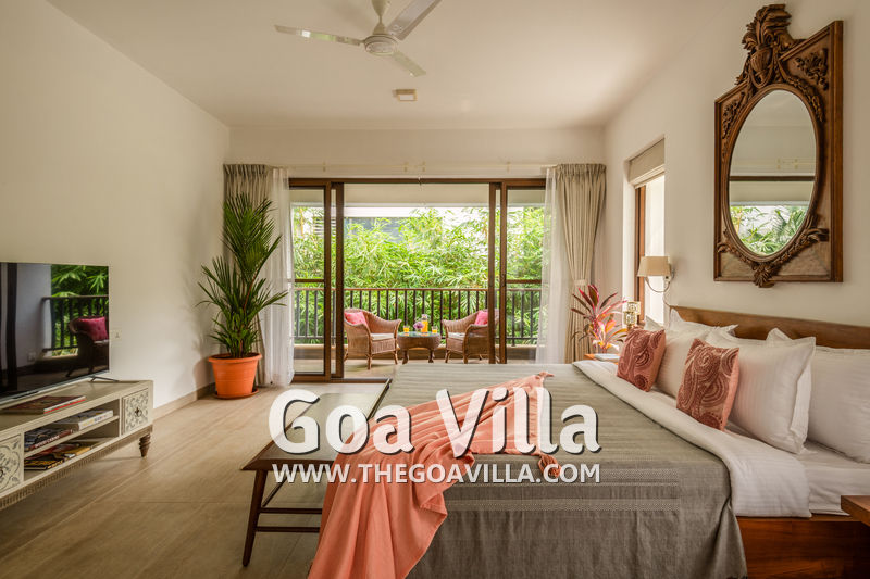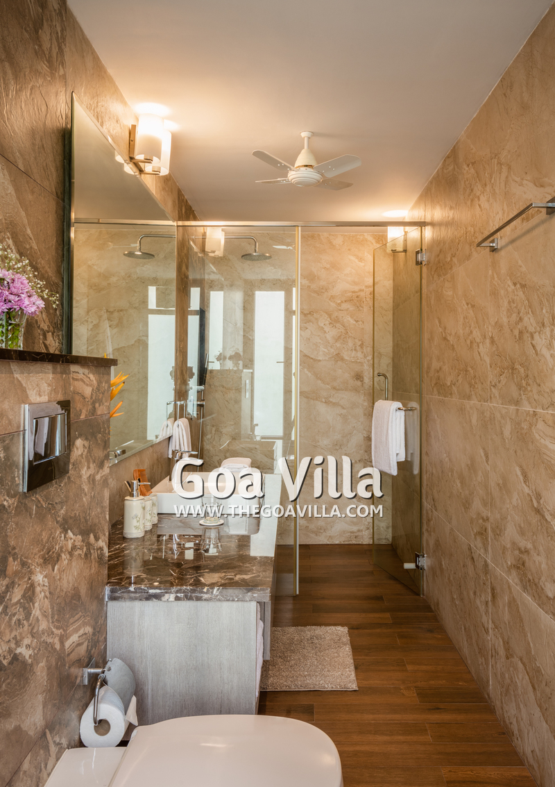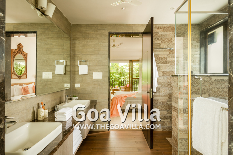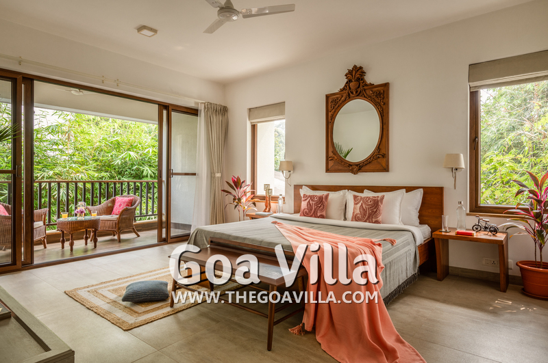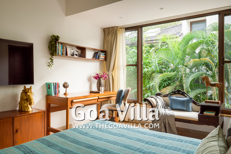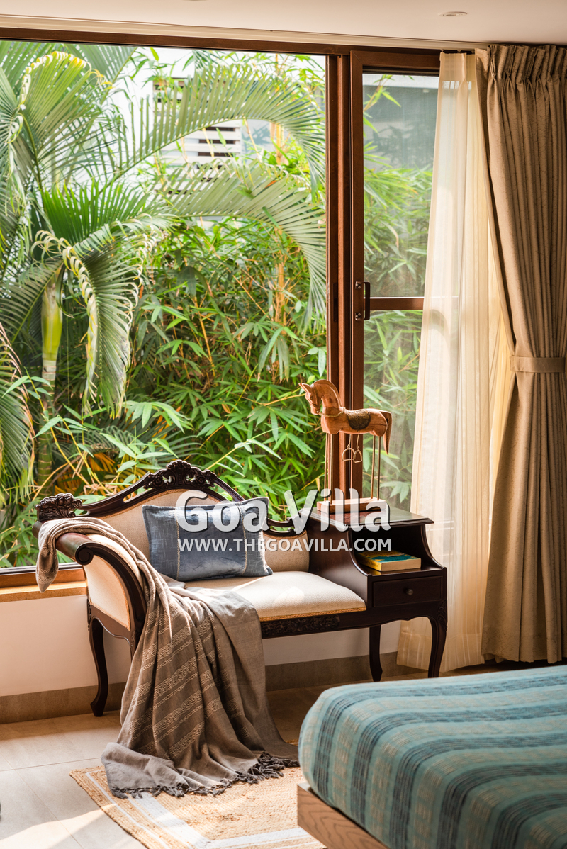 Swimming Pool – The villa treats you to sweeping panoramic views of Goa’s landscape. There is so much greenery all around that it feels like a nature reserve. A star attraction is the private swimming pool, which is placed within this greenery. You can swim anytime you want. The wooden terrace has an open-air cabana with armchairs. There is also an outdoor drencher shower and a small dining area.