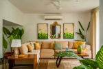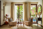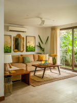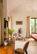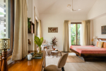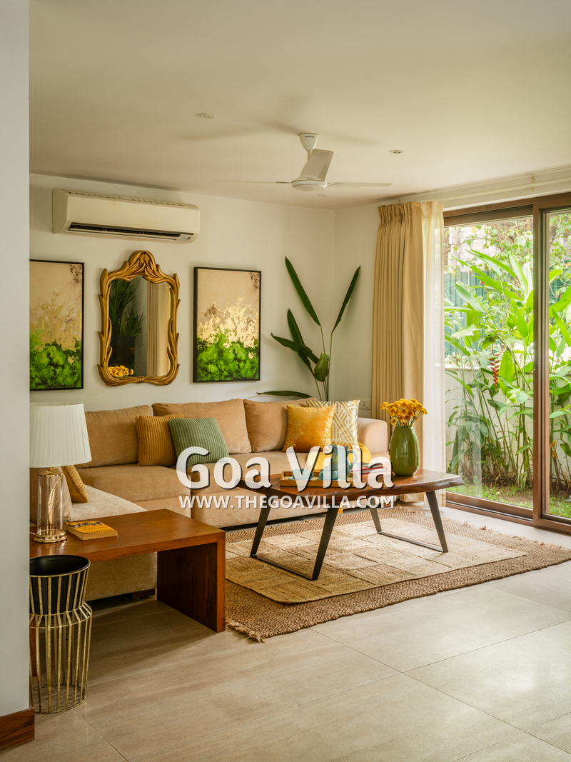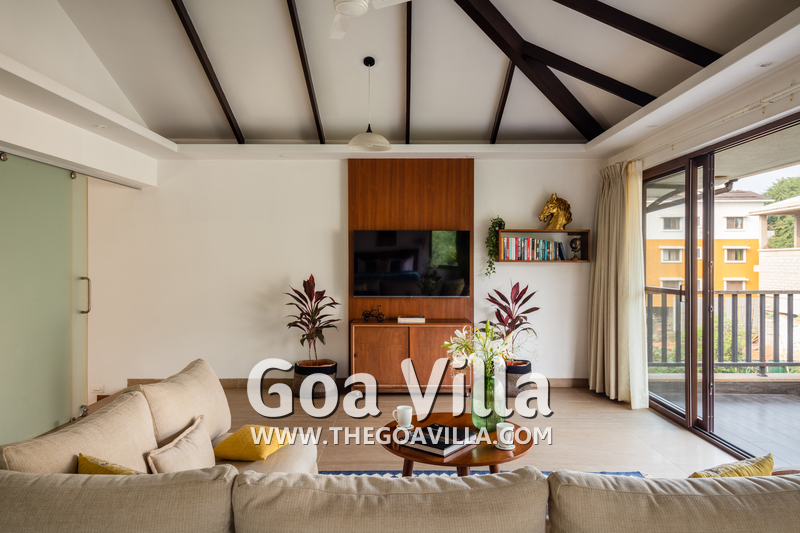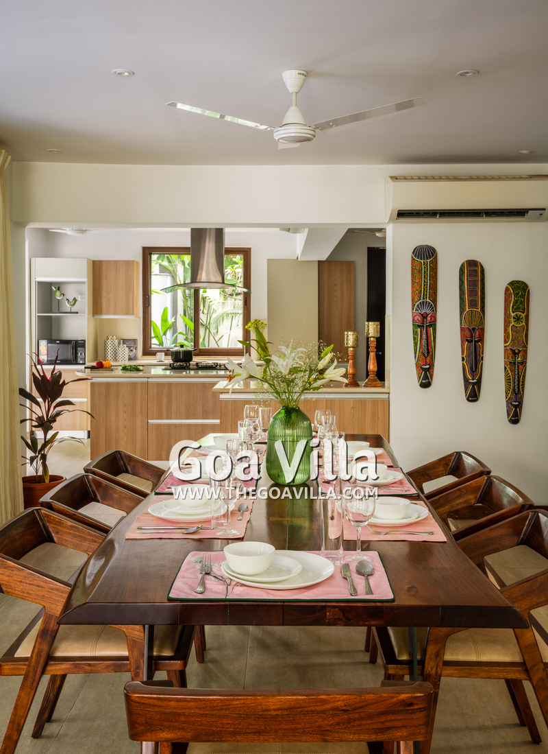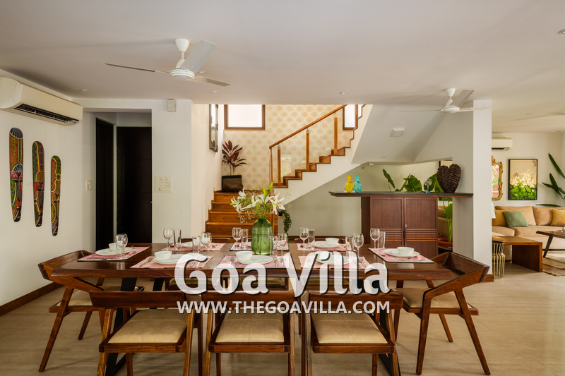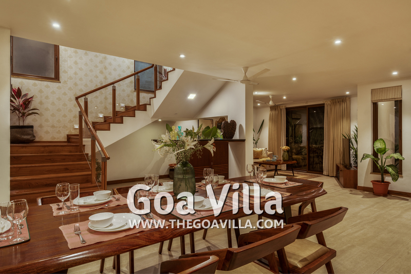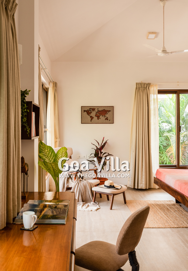 Living Room – Inside the villa, a soothing ambiance prevails, complemented by a palette of soft neutral tones. The cozy living room beckons with its large sofa where all the eight guests can spend an evening enjoying precious together-time. Play a session of board games, watch a movie, and plan what to see and do in Goa. You will also find elegant armchairs apart from the large sofa. A door from the living room opens to the swimming pool.