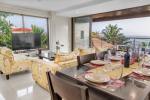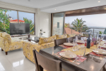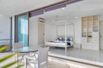 Living Room – The villa’s living room is on the first floor. It has a 3+ 2 sofa and a modern coffee table facing a large-screen television. You can watch a movie or your favorite sporting event. Or, you can spend time socializing with your group. Each corner of the interior space is aesthetically decorated, which will inspire and delight you at every turn. A ceiling-to-floor glass door opens to a shaded balcony, which too faces the ocean and the pool terrace.