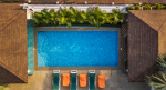 Swimming Pool – On entering the estate, you will reach the ground level, which has a massive private swimming pool. It will be exclusively for you and your group. Take a dip in its cool, refreshing water. Several loungers are placed on the poolside for your relaxation. Potted plants on the other side add a touch of greenery. There is also an open-air cabana with a leisurely sofa and an outdoor bar. A second cabana on the other side of the pool has an outdoor dining table.