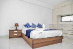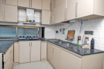 Dining, Kitchen – The dining table is placed just behind the living room sofa. You will find the fully-equipped kitchen behind this, which has many appliances, including a refrigerator, microwave, oven, and more. Daily breakfast is included with your stay. Some options include bread with butter or jam, paratha with curd, poha, upma, puri bhaji, chole bhatura, cutlet, grilled sandwich, club sandwich, tea, and coffee.