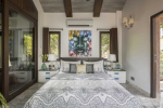 Bedrooms – Villa Serene Shore has three luxuriously appointed bedrooms, including one master suite. They all have large king beds with soft linen, high-quality mattresses, and extra pillows that will give you a restful night. They also have seating areas, bedside tables with reading lamps, and wardrobes with plenty of storage and hanging space. Windows provide river and garden views. Additionally, the master suite has a separate lounging area with leather sofas. A glass door opens to a balcony.