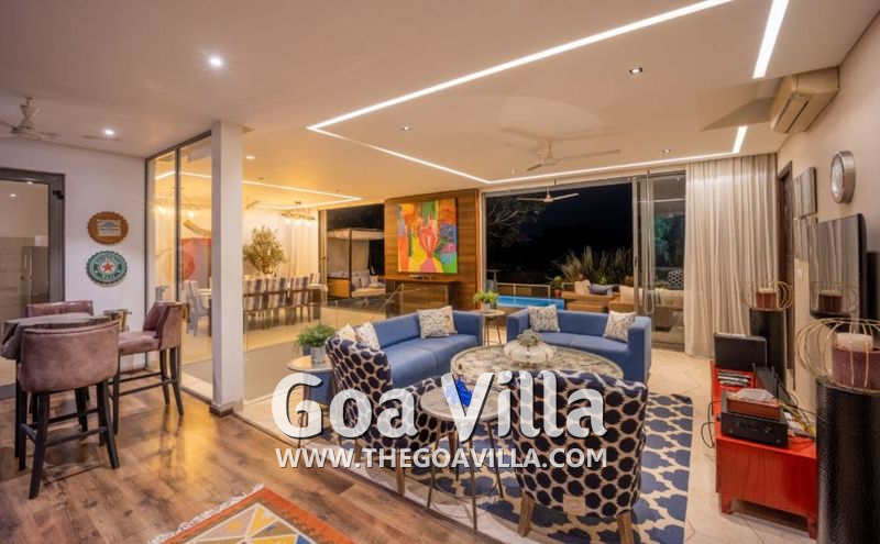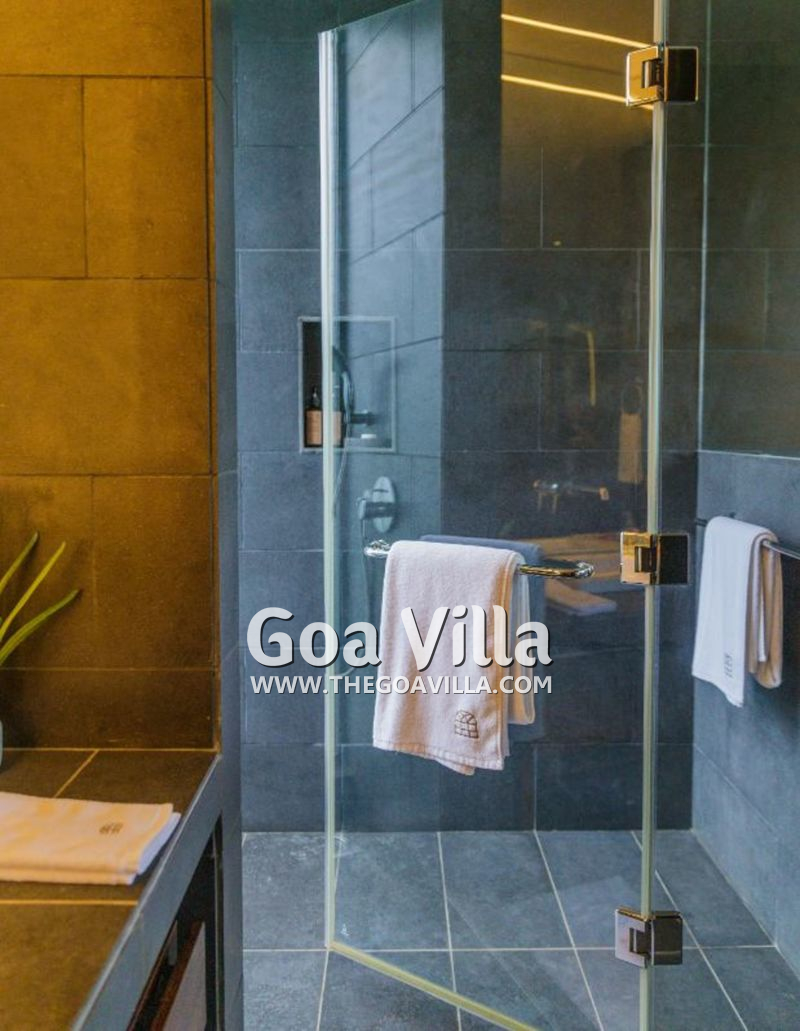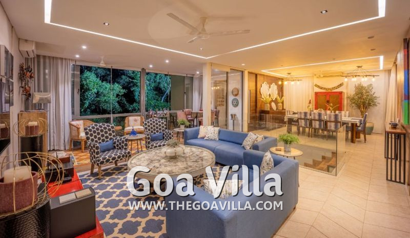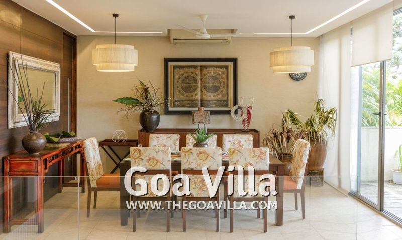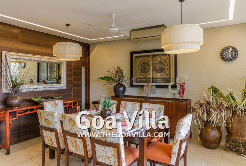 Living Room – The living room has a contemporary and classic décor. It is breezy and vibrant, a place where you want to return to after a long day of visiting many of Goa’s attractions. It’s an ideal place for relaxation and spending quality time with the family or friends. There are two large sofas and plenty of armchairs, which can easily seat everyone. There is a sound system and a large-screen television for your entertainment.