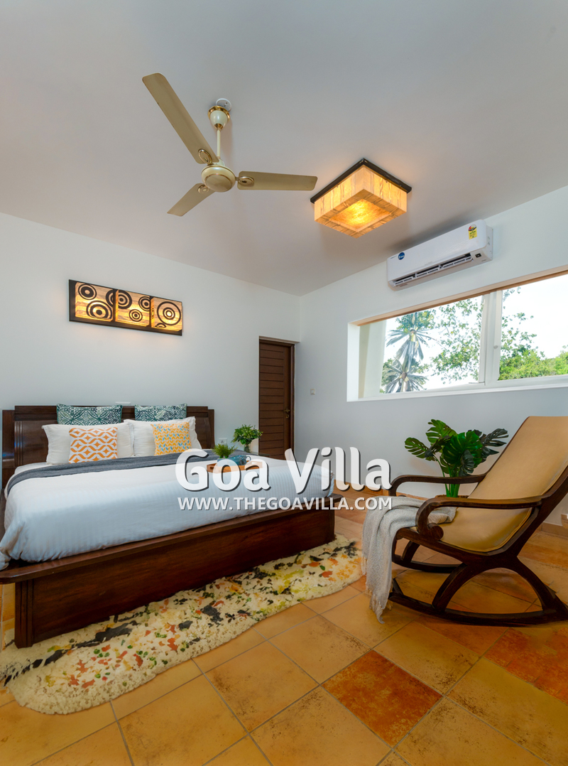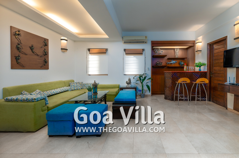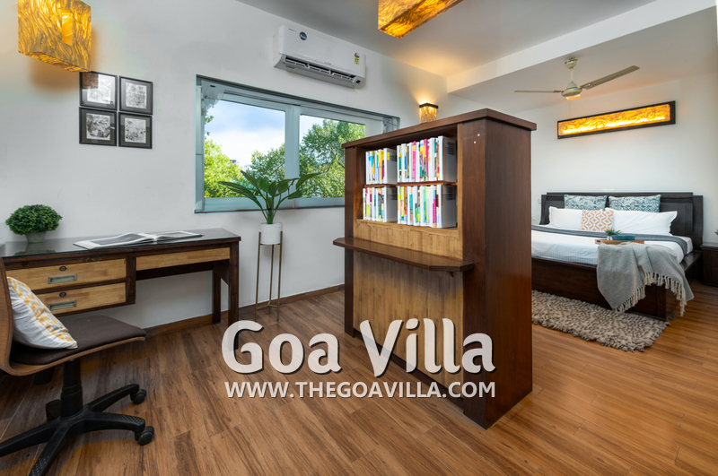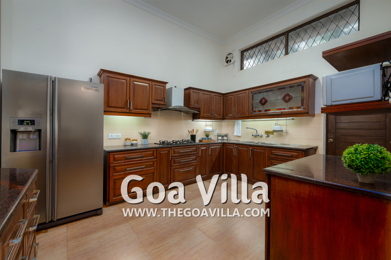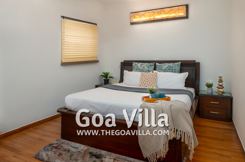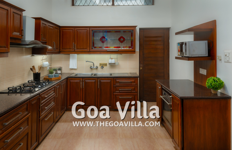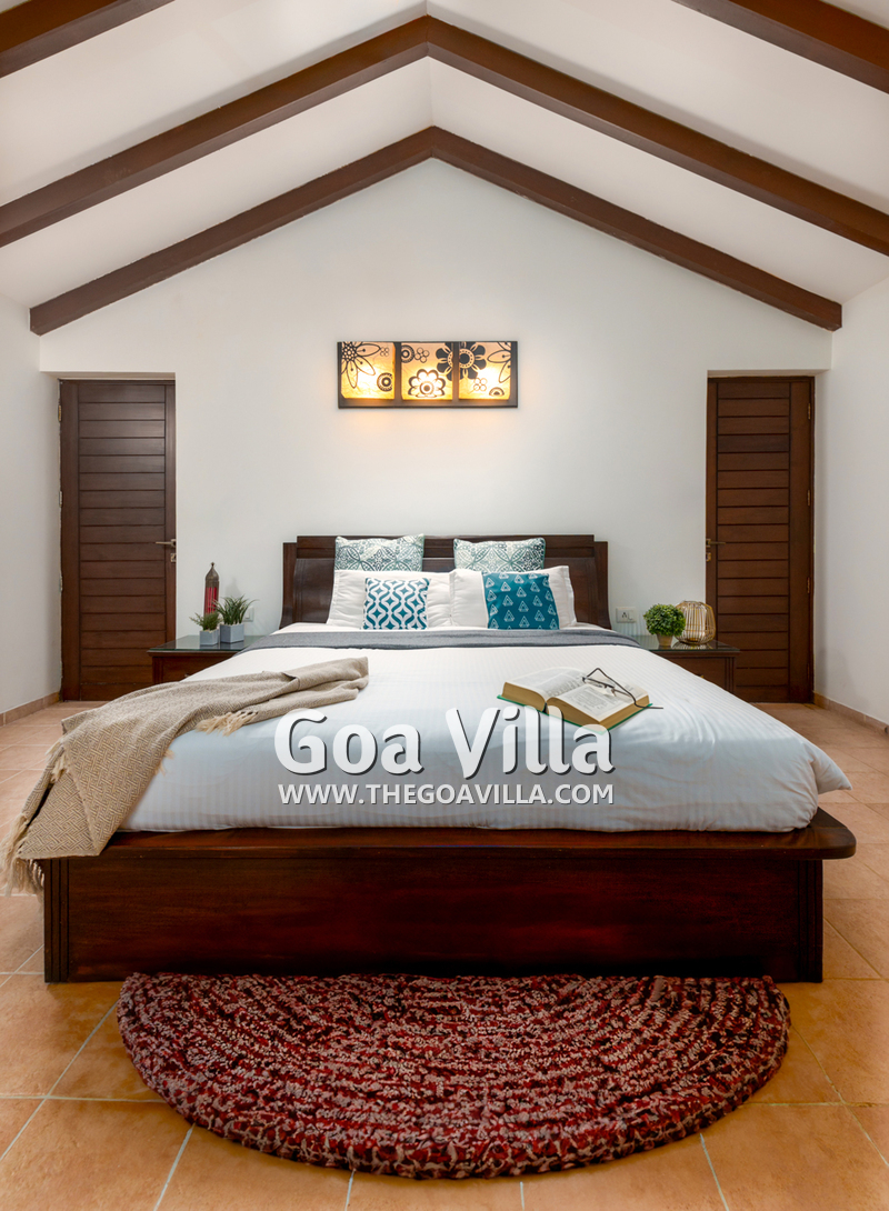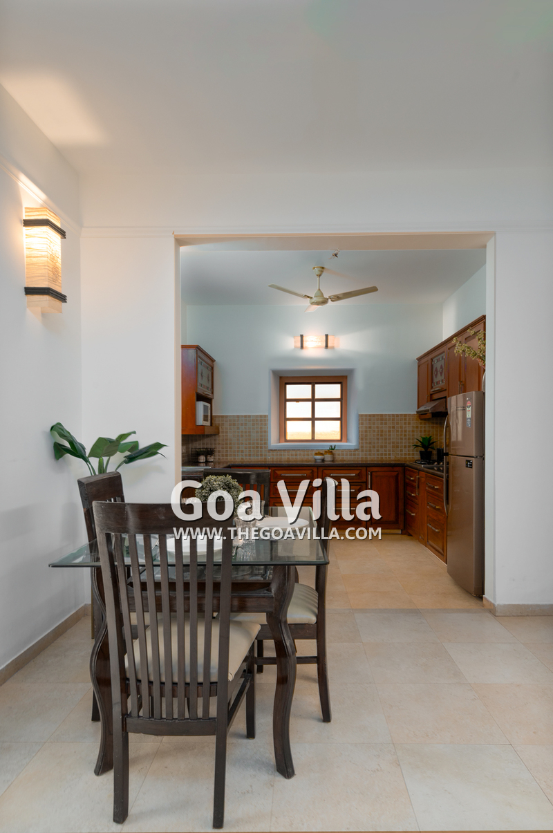 Dining, Kitchen – Like the lounging areas, you will also find two dining tables in this North Goa rental property, one on each floor. One of them is a more formal and elegant wooden table, while the second has a contemporary twist. The upper floor also has a bar. The big-sized kitchen has everything you need to cook and serve your meals. The villa’s staff will prepare and serve breakfast daily. You can choose from many options.