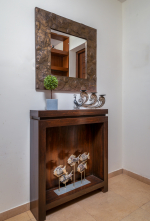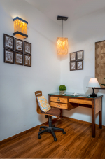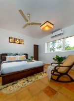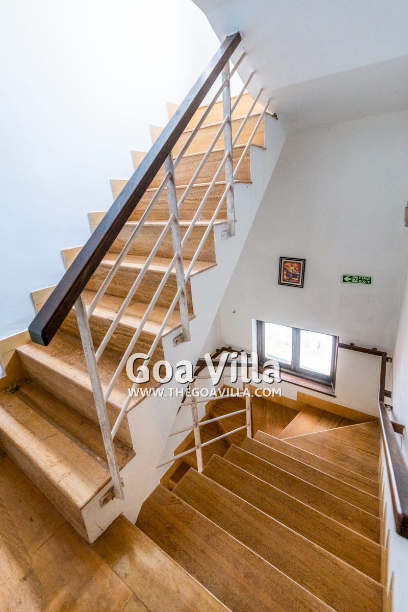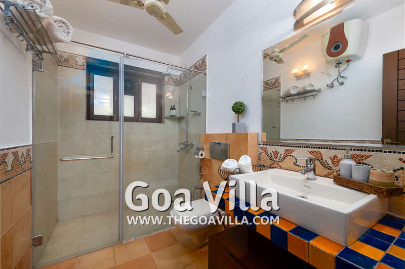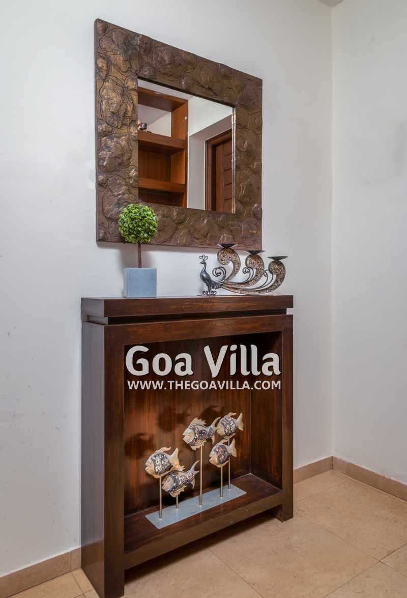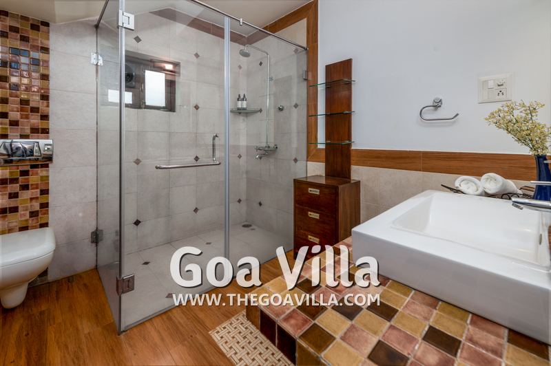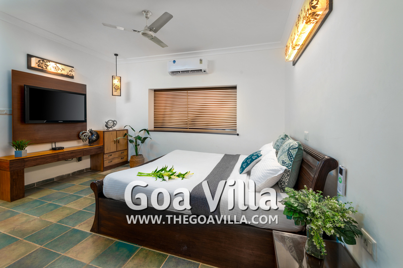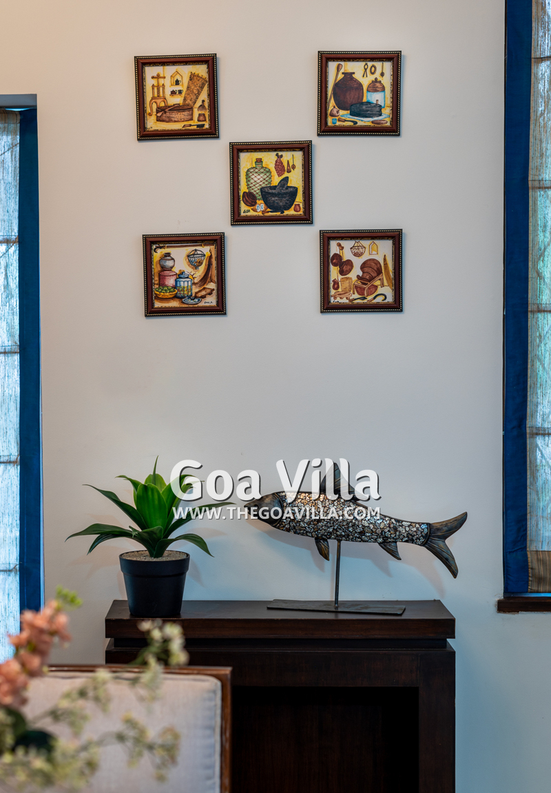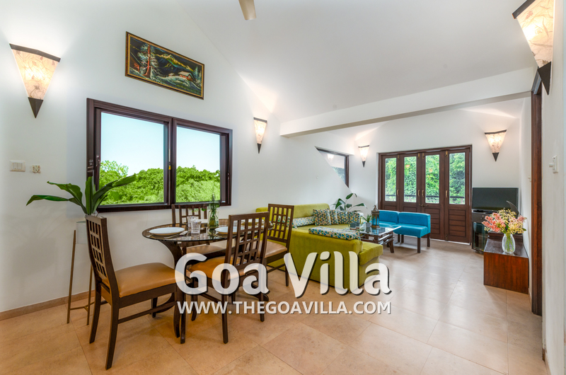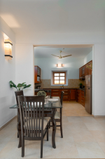 Dining, Kitchen – Like the lounging areas, you will also find two dining tables in this North Goa rental property, one on each floor. One of them is a more formal and elegant wooden table, while the second has a contemporary twist. The upper floor also has a bar. The big-sized kitchen has everything you need to cook and serve your meals. The villa’s staff will prepare and serve breakfast daily. You can choose from many options.
