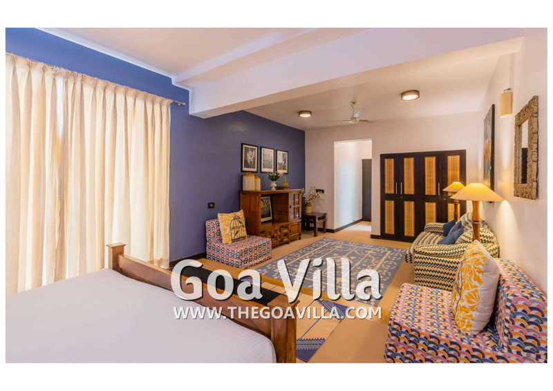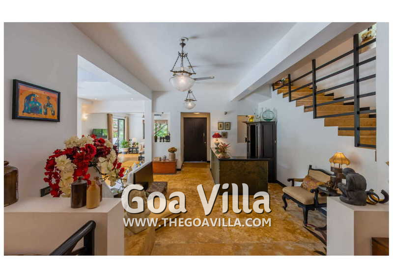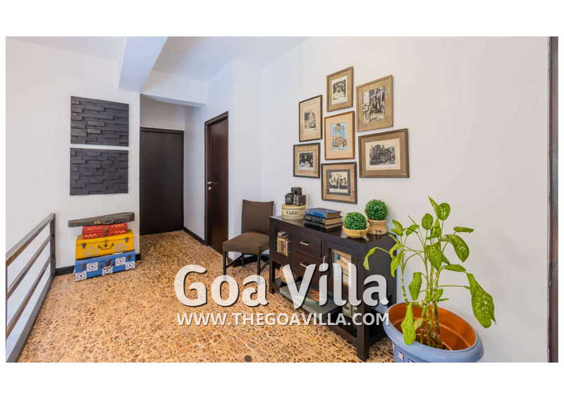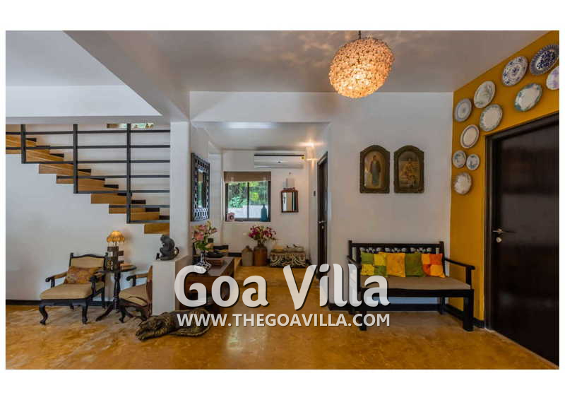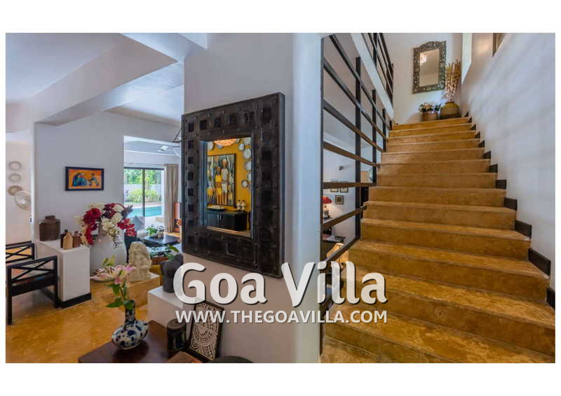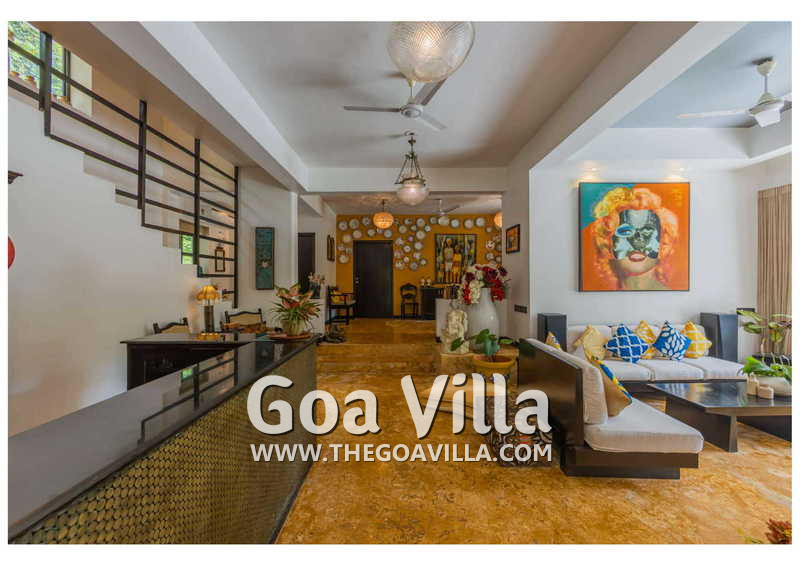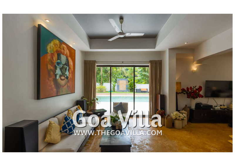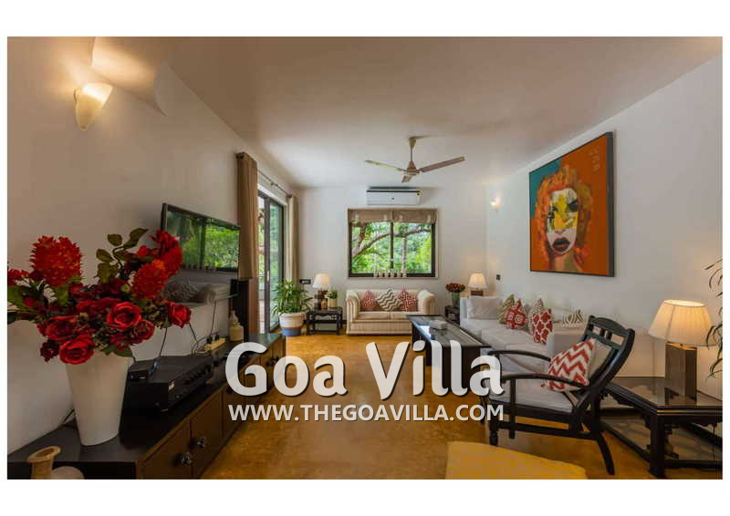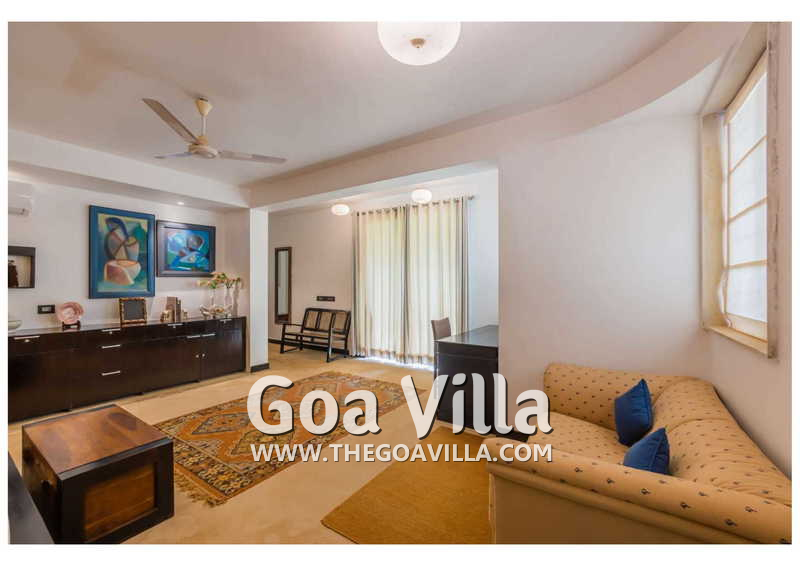 Living Room – Villa Skye is a large North Goa rental property. You will find several lounging areas of all sizes spread throughout the house. The ground floor living room has two sofa areas, one facing the pool, and a second, arranged around the large-screen television. There is a music system too. Several pictures and objects of art decorate the space. The first floor has a second lounging space with a small library and some old photos. And, as you enter the house, you will find a third area, which acts as a very nice transition between the outdoors and the indoors.