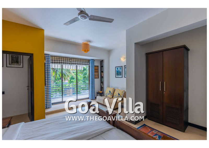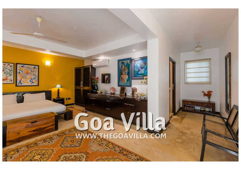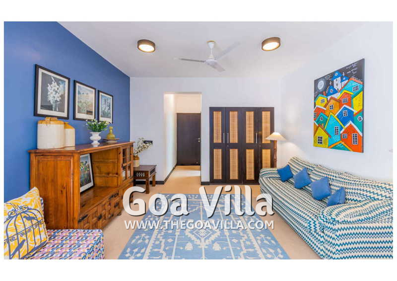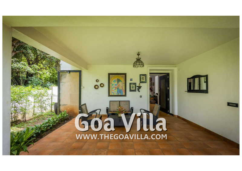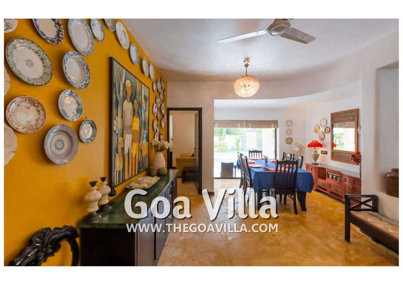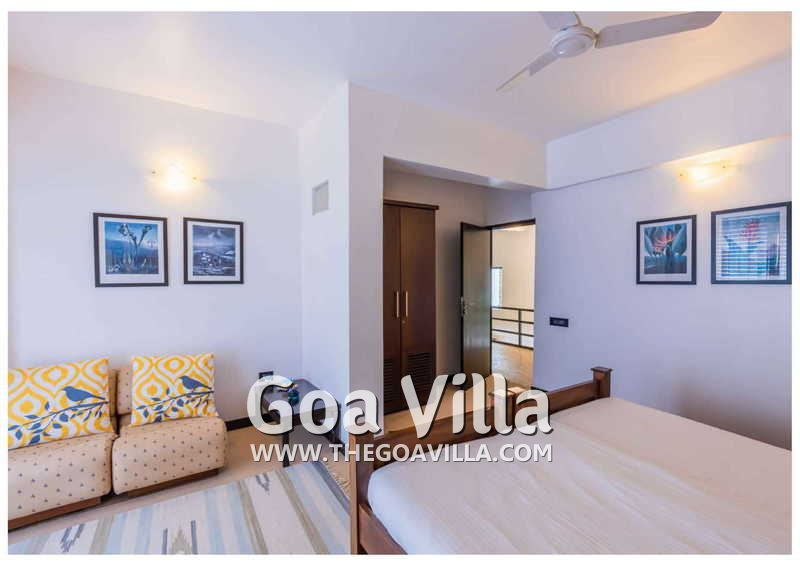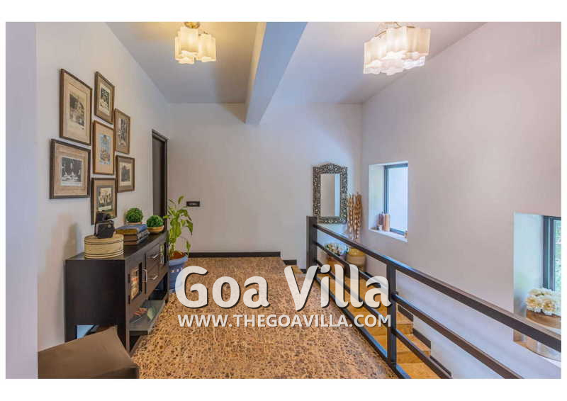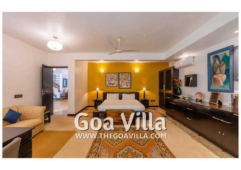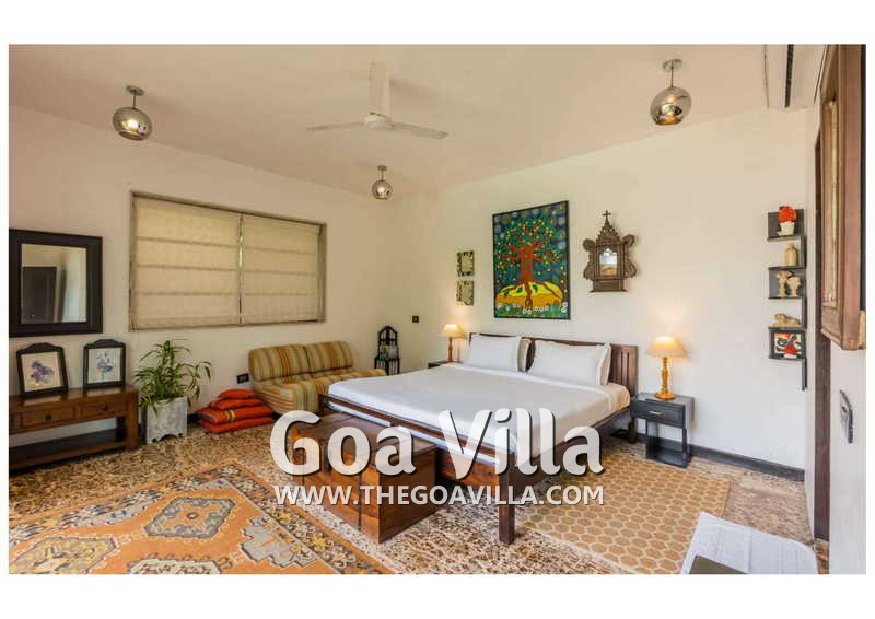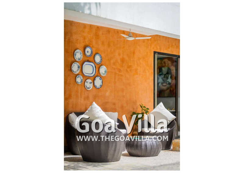 Living Room – Villa Skye is a large North Goa rental property. You will find several lounging areas of all sizes spread throughout the house. The ground floor living room has two sofa areas, one facing the pool, and a second, arranged around the large-screen television. There is a music system too. Several pictures and objects of art decorate the space. The first floor has a second lounging space with a small library and some old photos. And, as you enter the house, you will find a third area, which acts as a very nice transition between the outdoors and the indoors.