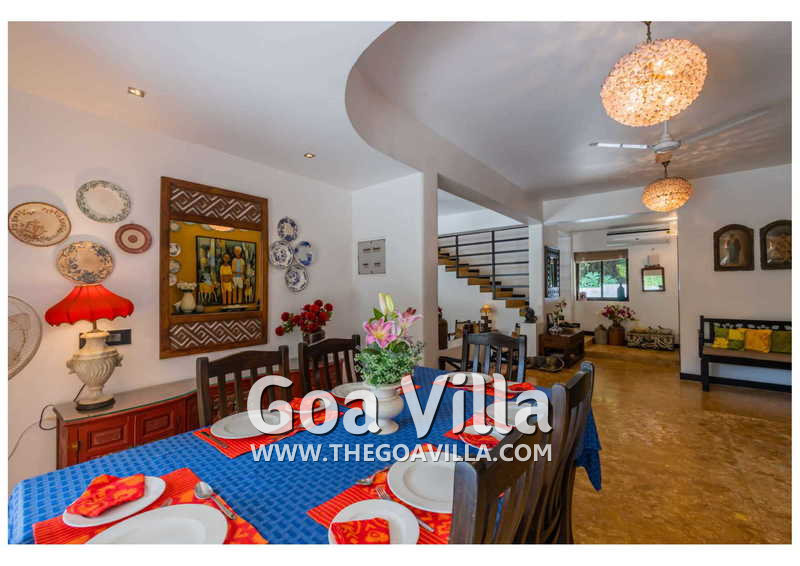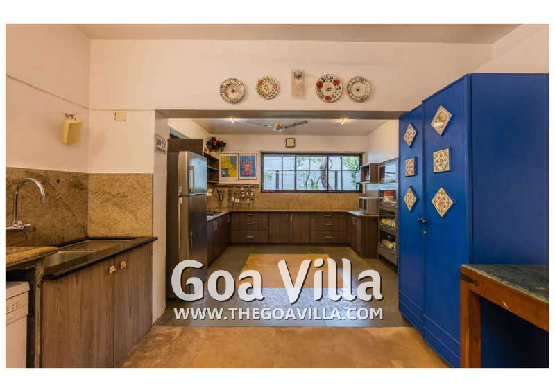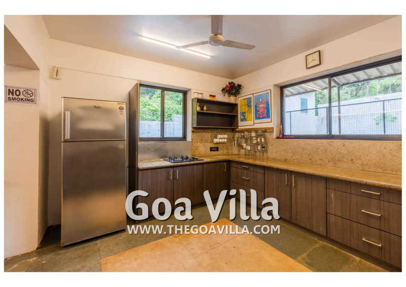Dining, Kitchen – The dining area, which has a 6-seater table, is also on the ground floor. This room is also air-conditioned like the bedrooms and the formal living room. A door from here leads to the pool terrace. This North Goa villa for rent has a big-sized kitchen where you will find all types of cooking appliances. There is also a refrigerator and a washing machine.