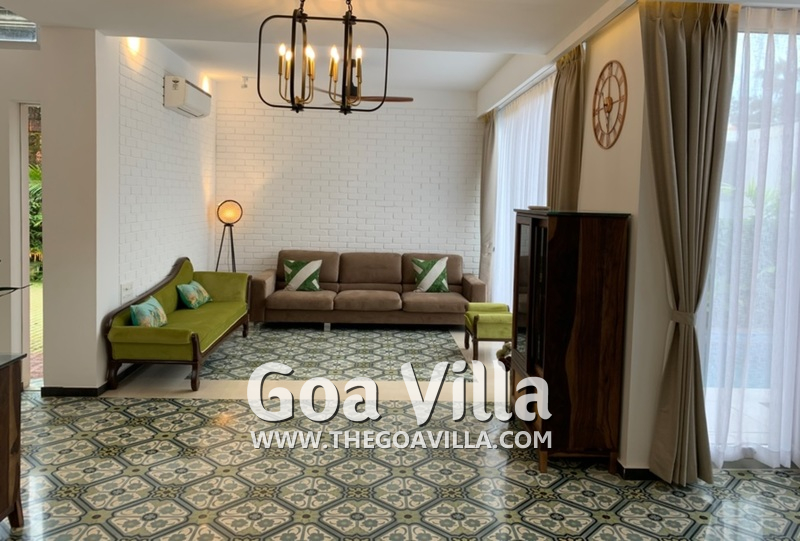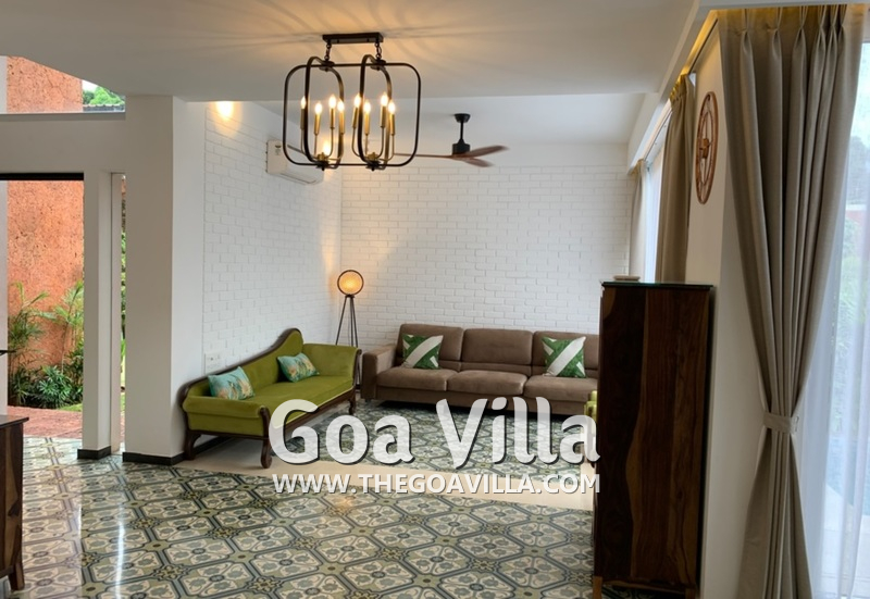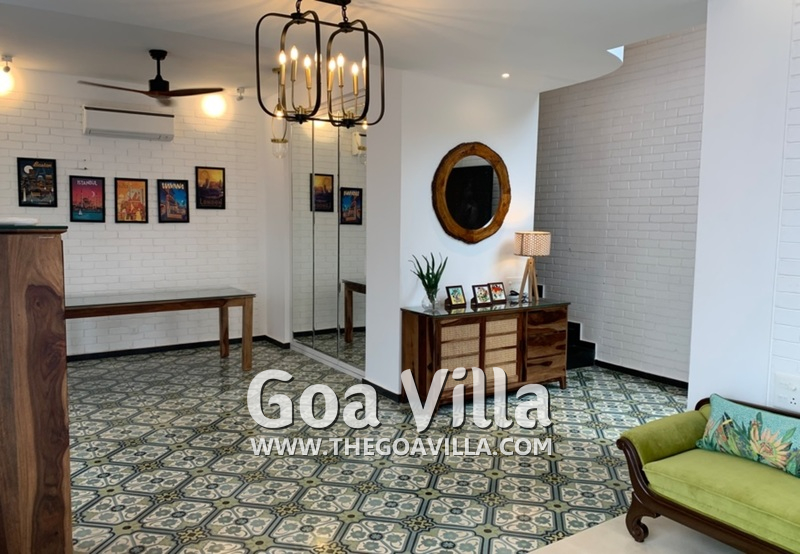 Living Room – You will reach the living room after entering the house through the wide gate. It is a very nice airy room with many comfortable seating options. Beautiful cushions, chandeliers, and lamp shades decorate the space. The terracotta tiled flooring is traditional Portuguese. Spend time together with your family or friends here when you are in the house. The living room is completely air-conditioned.