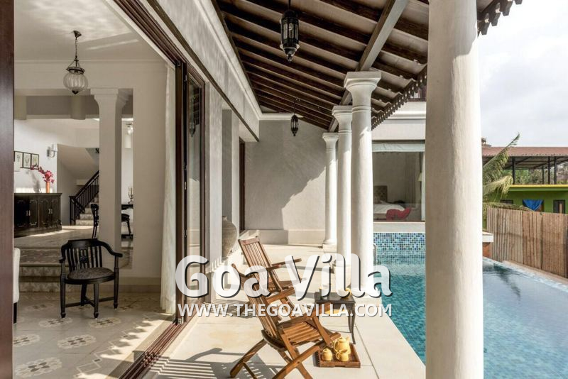 Swimming Pool – Guests staying at this North Goa villa for rent will have exclusive access to a wonderful private pool. It is an infinity pool that hangs at the edge with the hills and valleys on the other side. The pool is surrounded by lush greenery, which provides a respite to the soul. On the other side of the pool, you will find a traditional covered veranda with loungers where you can relax after a swim.