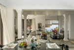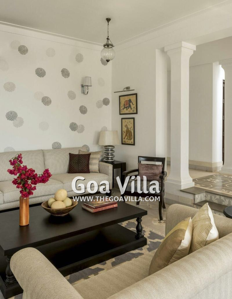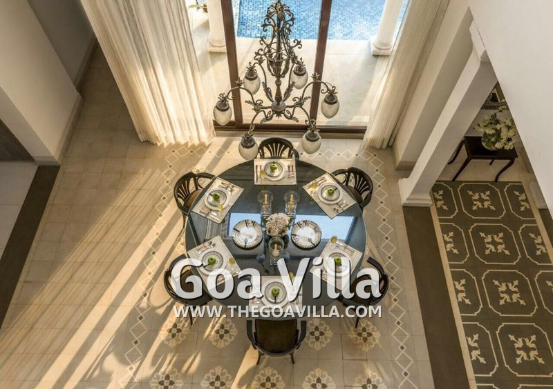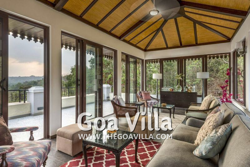 Living Room – Serene Sol villa is impeccably designed with a touch of Goan/Contemporary look and feel. The innovative design, architecture, and location make Serene Sol the perfect choice for a luxury living experience in the lap of nature. On entering the house, you will reach a fabulous lounging area, which has many sofas and armchairs. Various antiques and objects of art decorate the space. There is a second sitting area on the upper floor. You can call this the ‘Glass Room’ as three sides of this room are made entirely of glass windows. Several glass doors from here lead to a fantastic terrace.