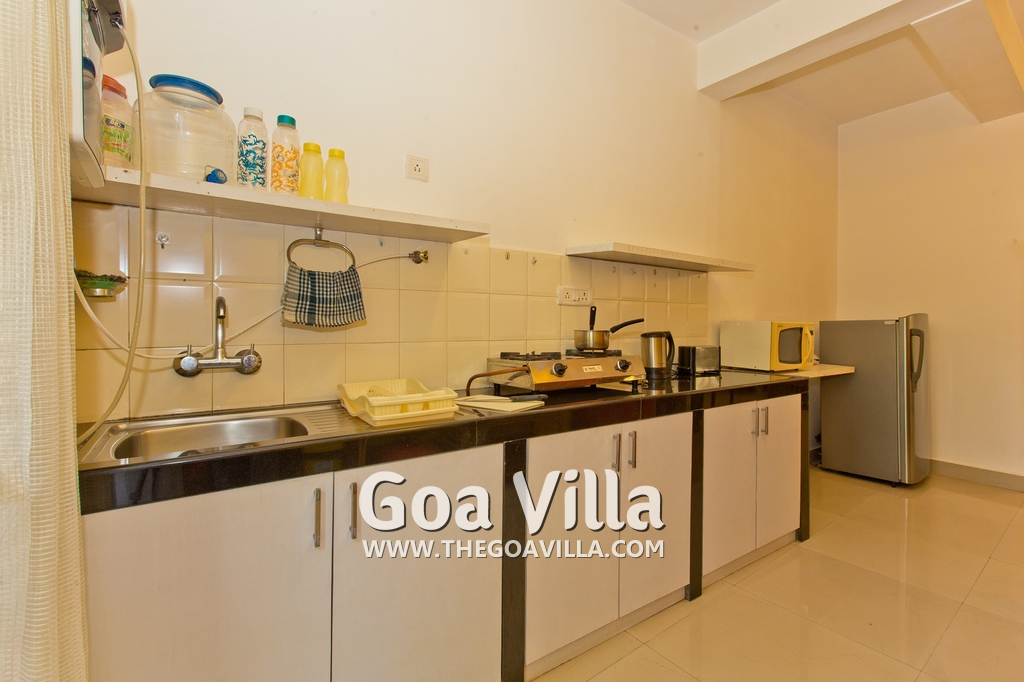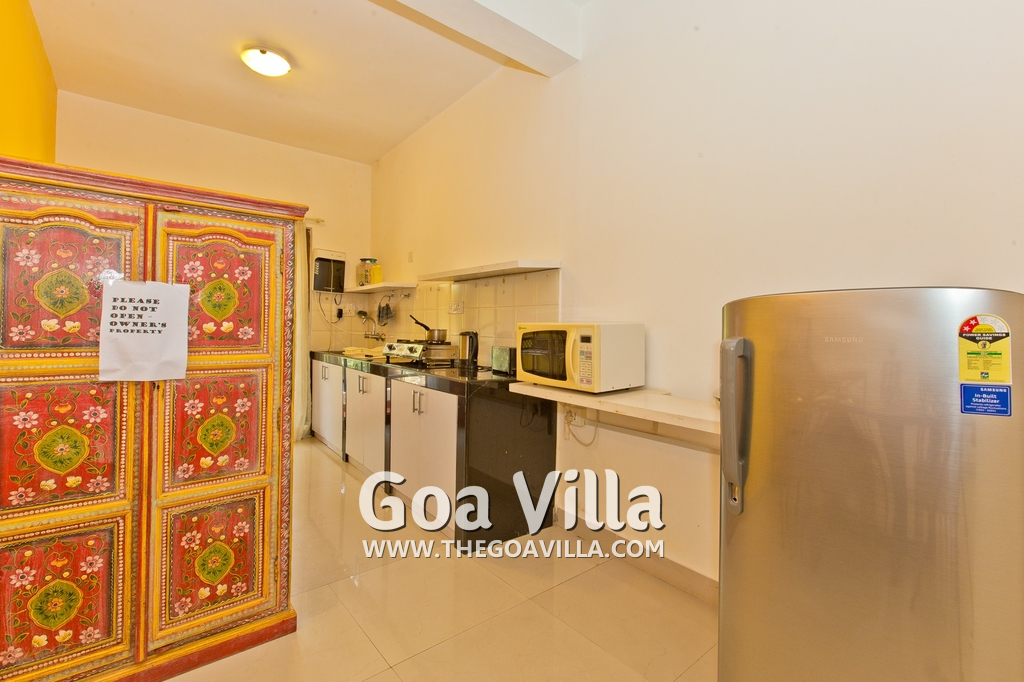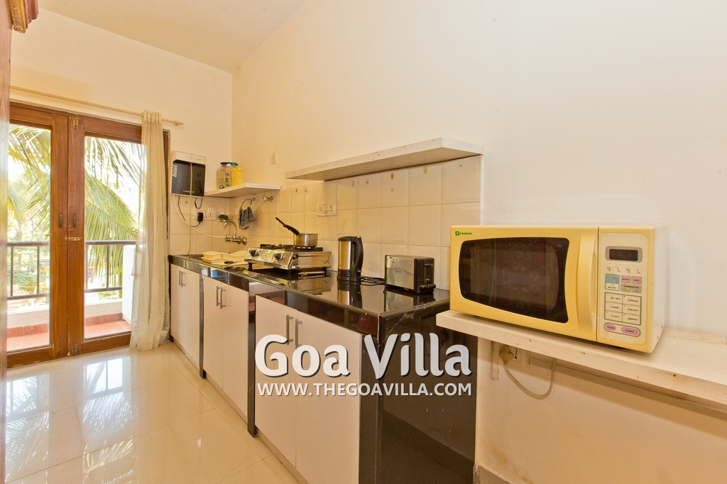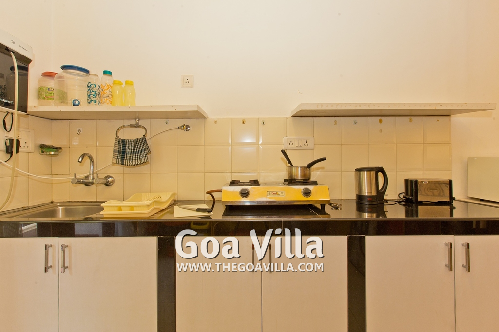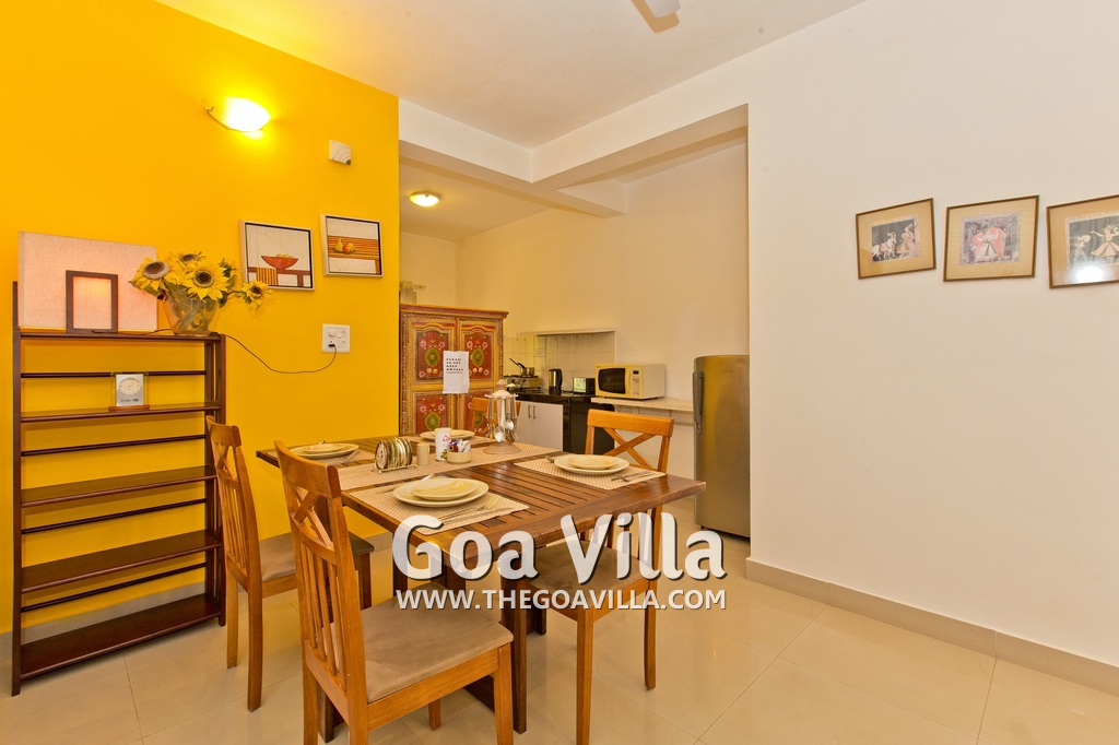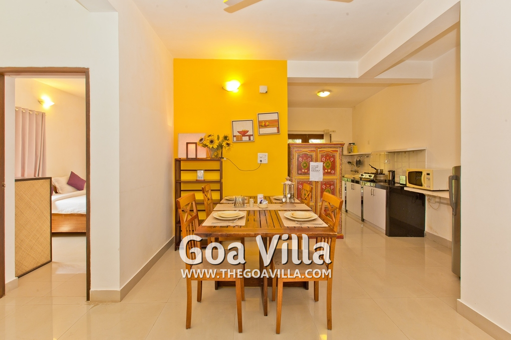 Dining, Kitchen – The is a small wooden dining table sits all the 4 guests. The apartment has a well-equipped kitchen you can use during your stay in Goa. It has a stove, electric kettle, microwave, toaster, refrigerator, and water purifier. If you prefer, you can also ask for chef service.