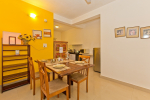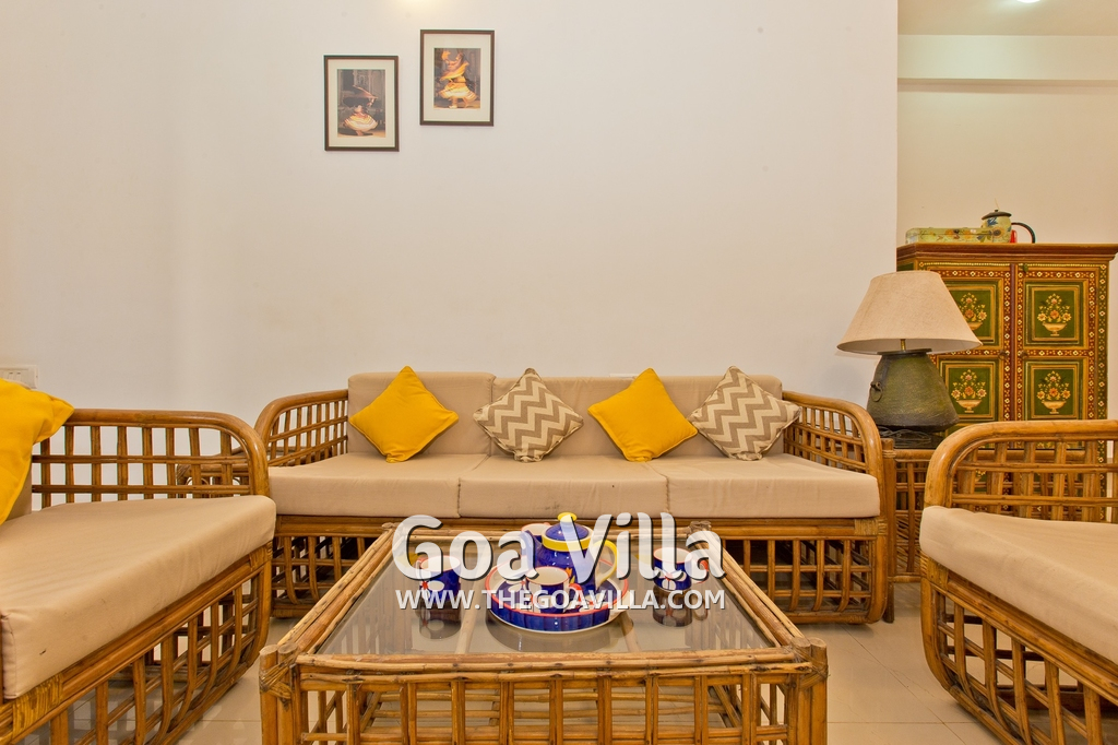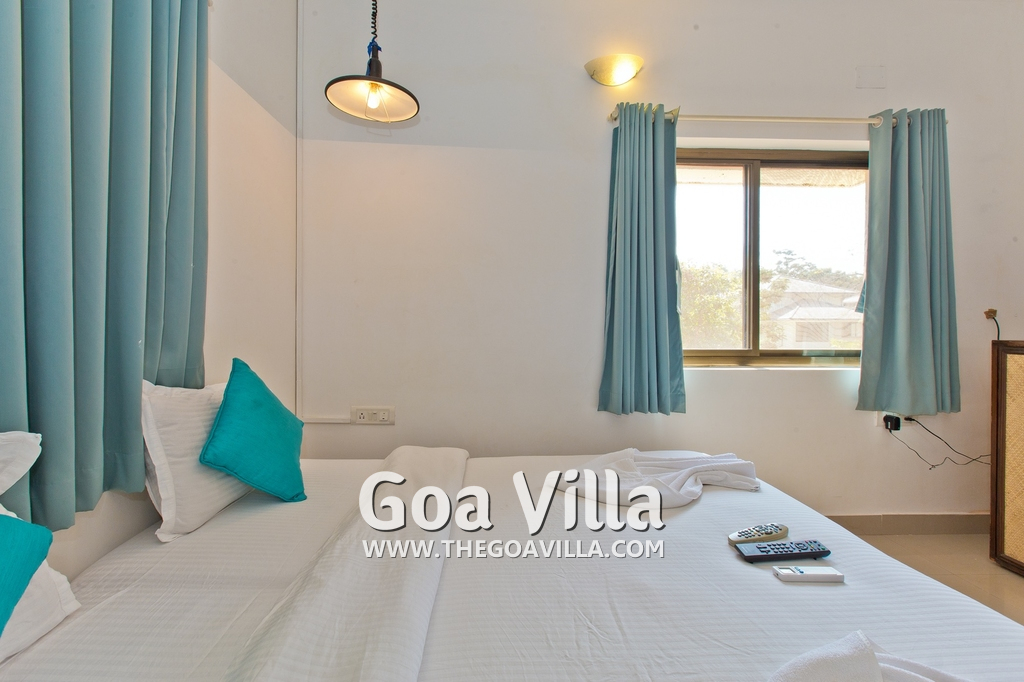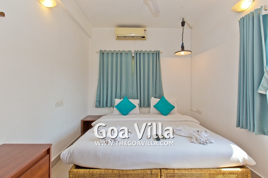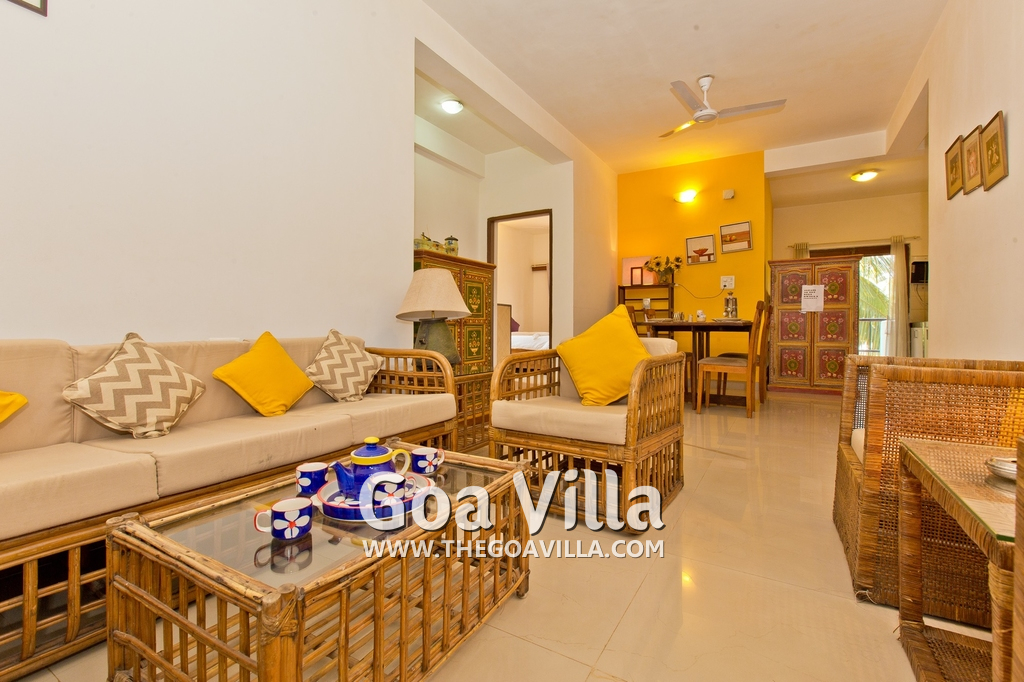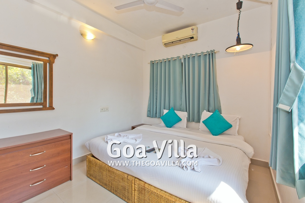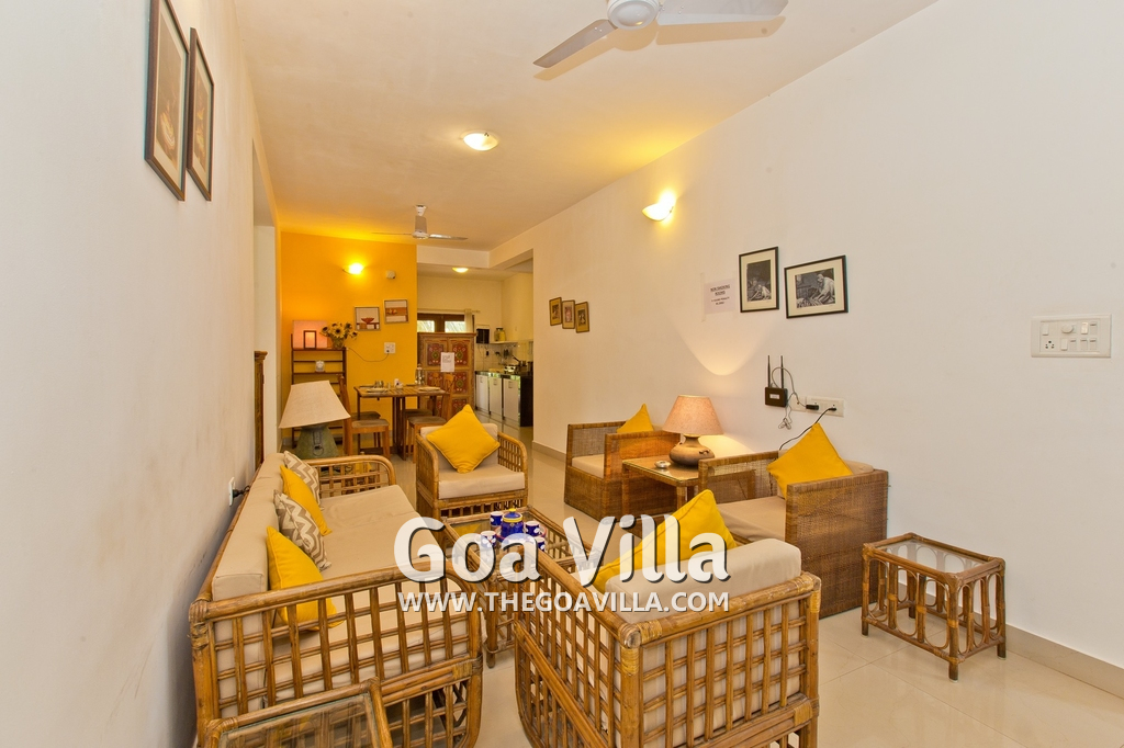 Dining, Kitchen – The is a small wooden dining table sits all the 4 guests. The apartment has a well-equipped kitchen you can use during your stay in Goa. It has a stove, electric kettle, microwave, toaster, refrigerator, and water purifier. If you prefer, you can also ask for chef service.