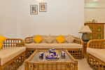 Living Room – Sol Apartment’s living room is simple but very comfortable. There is a traditional cane sofa with colorful cushions and a cane coffee table. Lamp shades are placed on the side tables. There is a beautiful Rajasthani handmade wardrobe. Paintings decorate the walls.