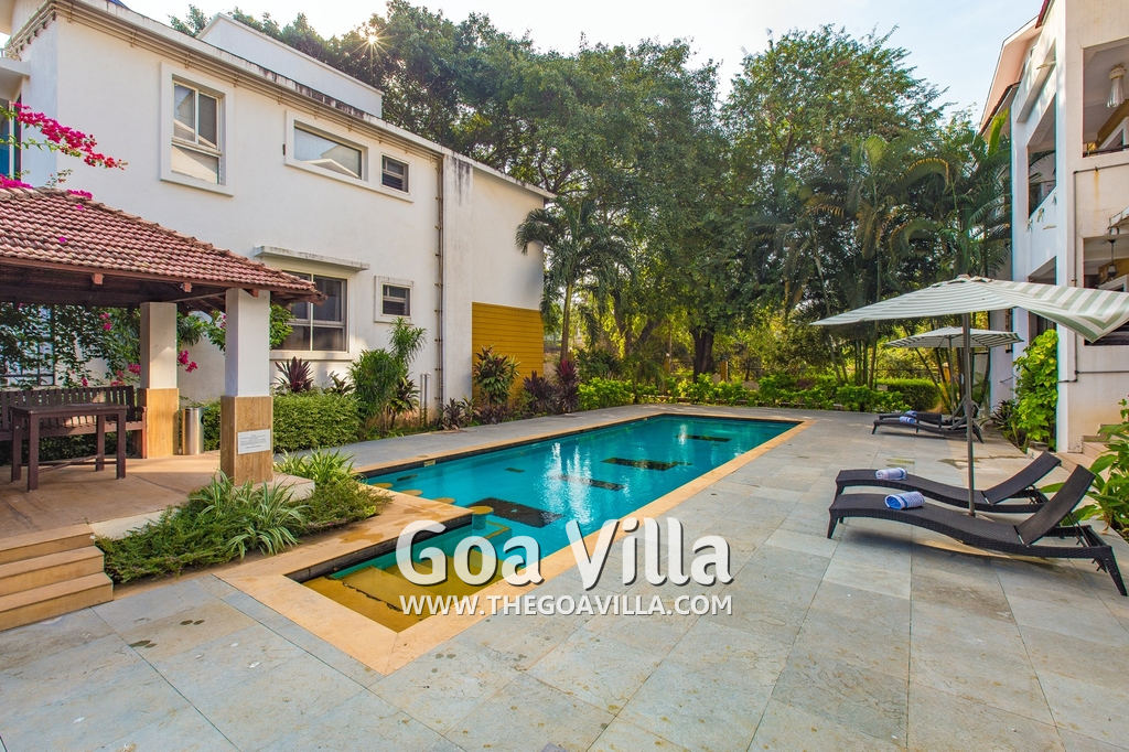 Swimming Pool – The apartment complex has a large central pool area. The private swimming pool is only for the apartment owners and their guests. Staircase leads gently into the water. Splash around in the pool or relax on the loungers placed on the sundeck. There are tall trees and a lot of greenery all around the pool. Towels are provided separately for the swimming pool.