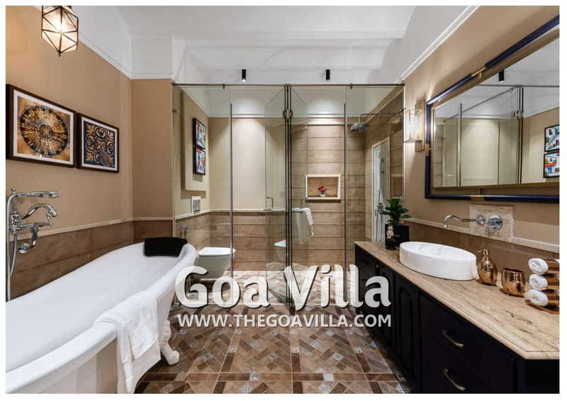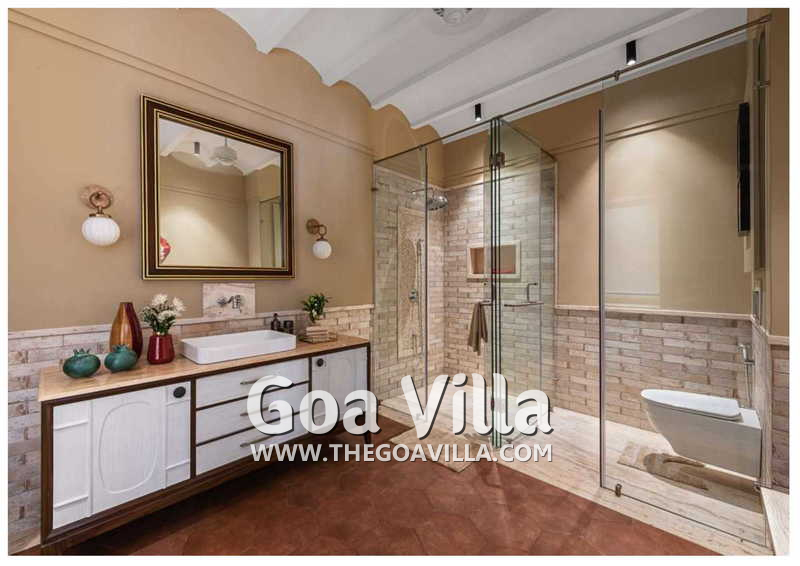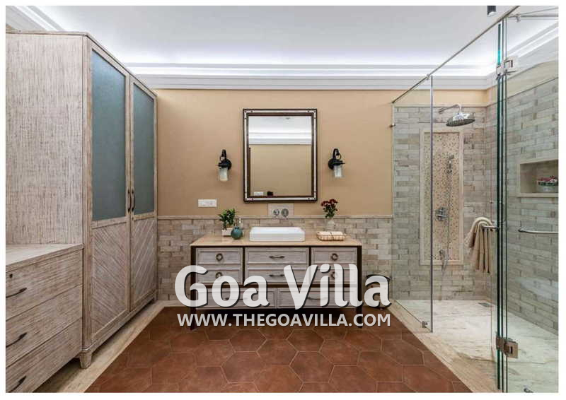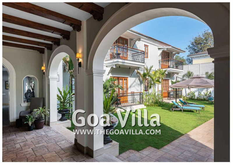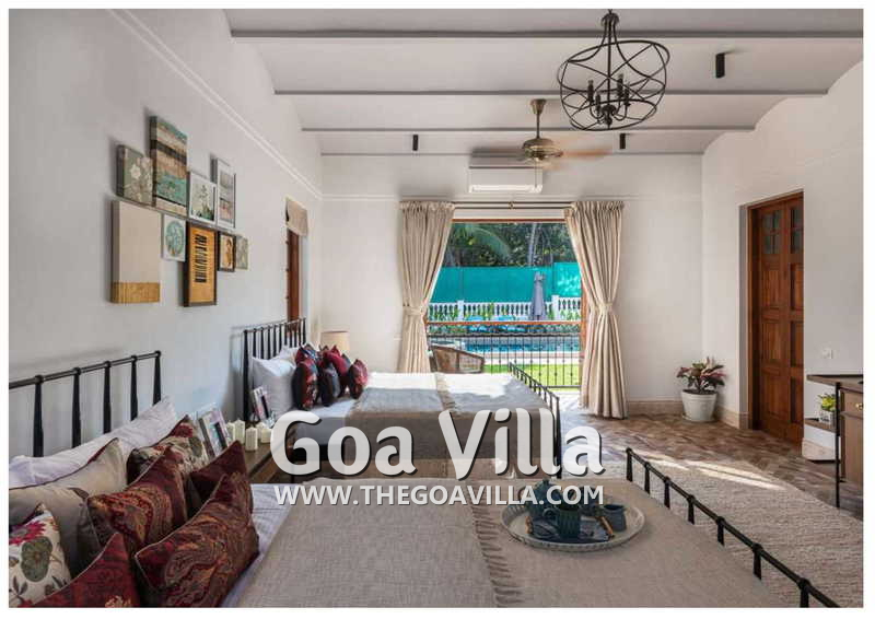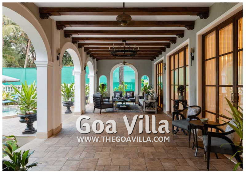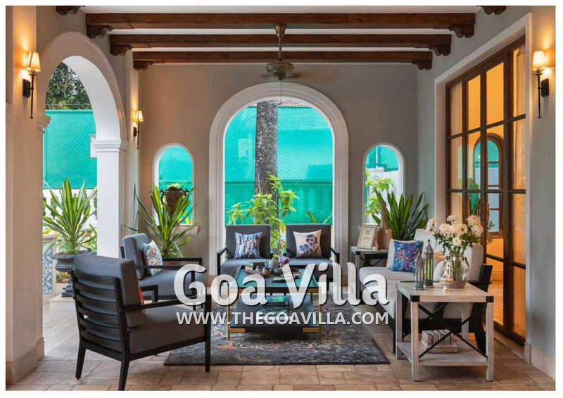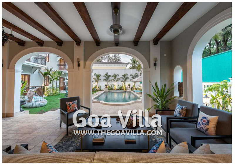 Swimming Pool – Another reason that makes this luxury villa in Goa truly spectacular is its impressive outdoor area. Its central courtyard features a garden, manicured lawn, and a private swimming pool with a shallow end. Several loungers and garden chairs are placed on the green patch beside the pool. At one end of the pool, you will also find a Jacuzzi. A shaded verandah runs through the other side with a beautiful seating arrangement.